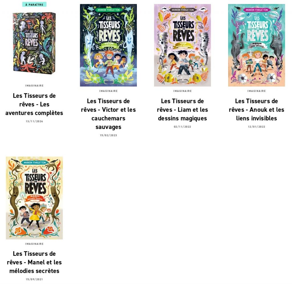 Le livre lauréat 2024 est lui aussi le premier d’une série appelée « Les Tisseurs de rêves ». Cette série est éditée également par Rageot entre 2021 et 2024.