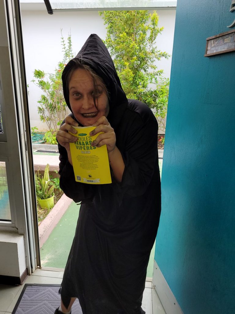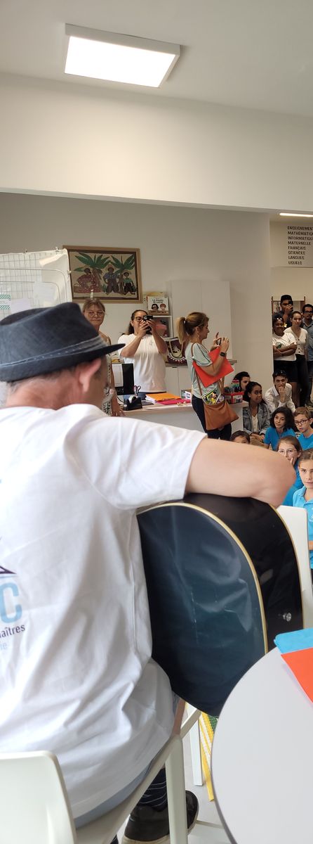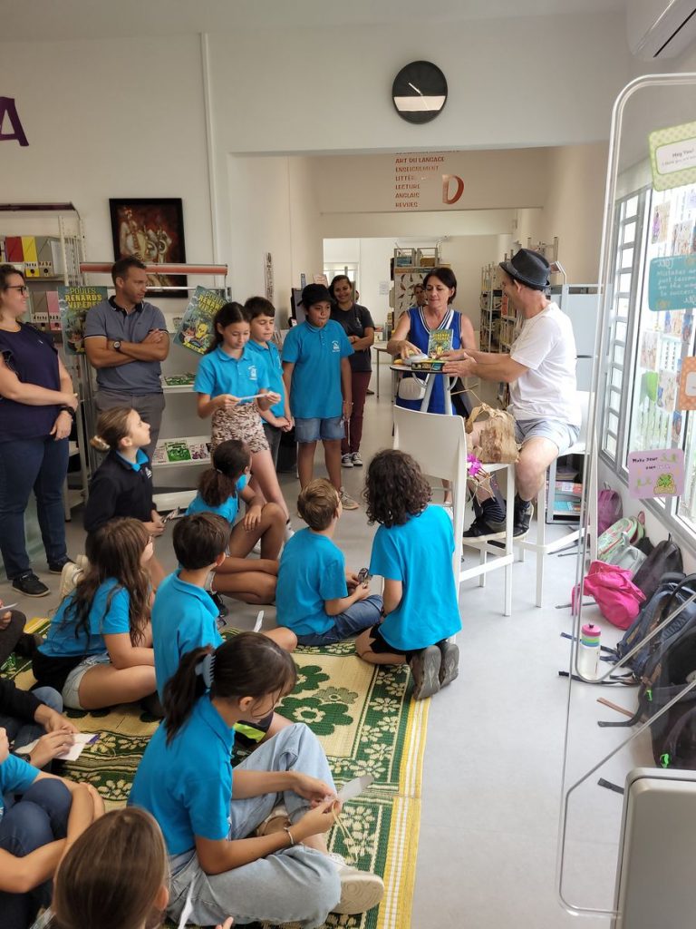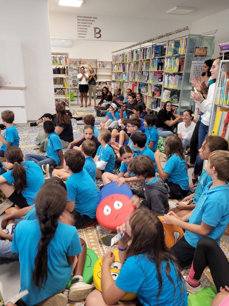 Ce jeu d’évasion autour de la sélection Livre mon ami 2023 était mené par les étudiants de première année de l’IFMNC à la médiathèque MPENC. Pour résoudre l’énigme, avec chaque indice collecté dans les différents ateliers, les enfants ont créé des phrases autour du plaisir de lire et Paul Ivoire, accompagné de sa guitare bleue, leur a chanté un texte autour de Poules Renards Vipères.