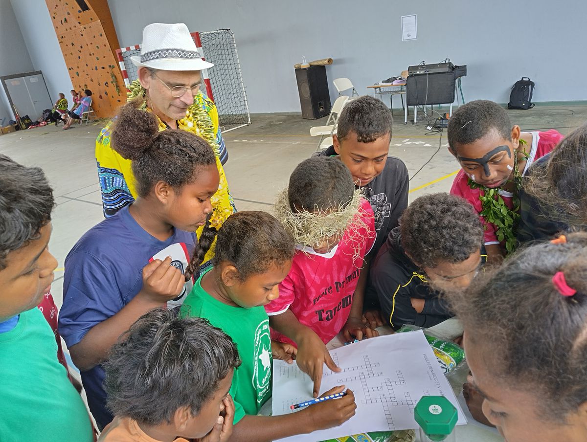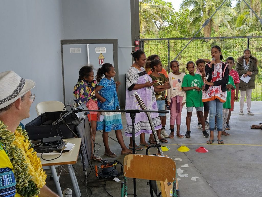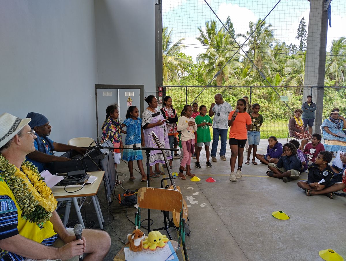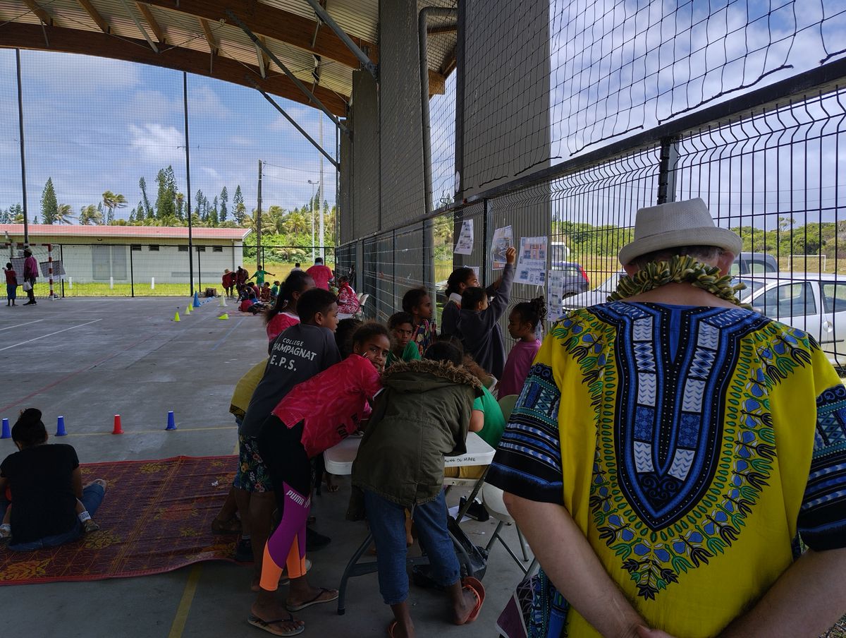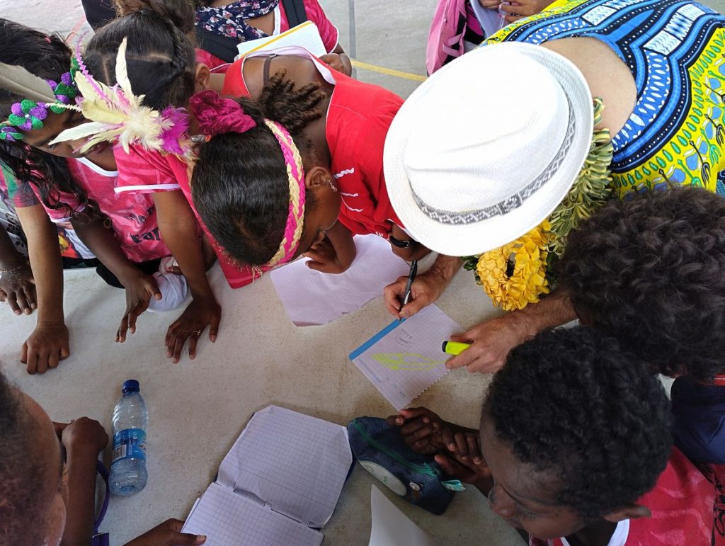 Ce vendredi matin, Paul avait donc rendez-vous avec les classes du collège public de Tadine, du collège privé de Taremen, la totalité des élèves de CM2 des quatre secteurs de l’île (enseignement public et privé)… Pas moins de 150 élèves s’étaient réunis sous la grande halle municipale de la tribu de Wabao.