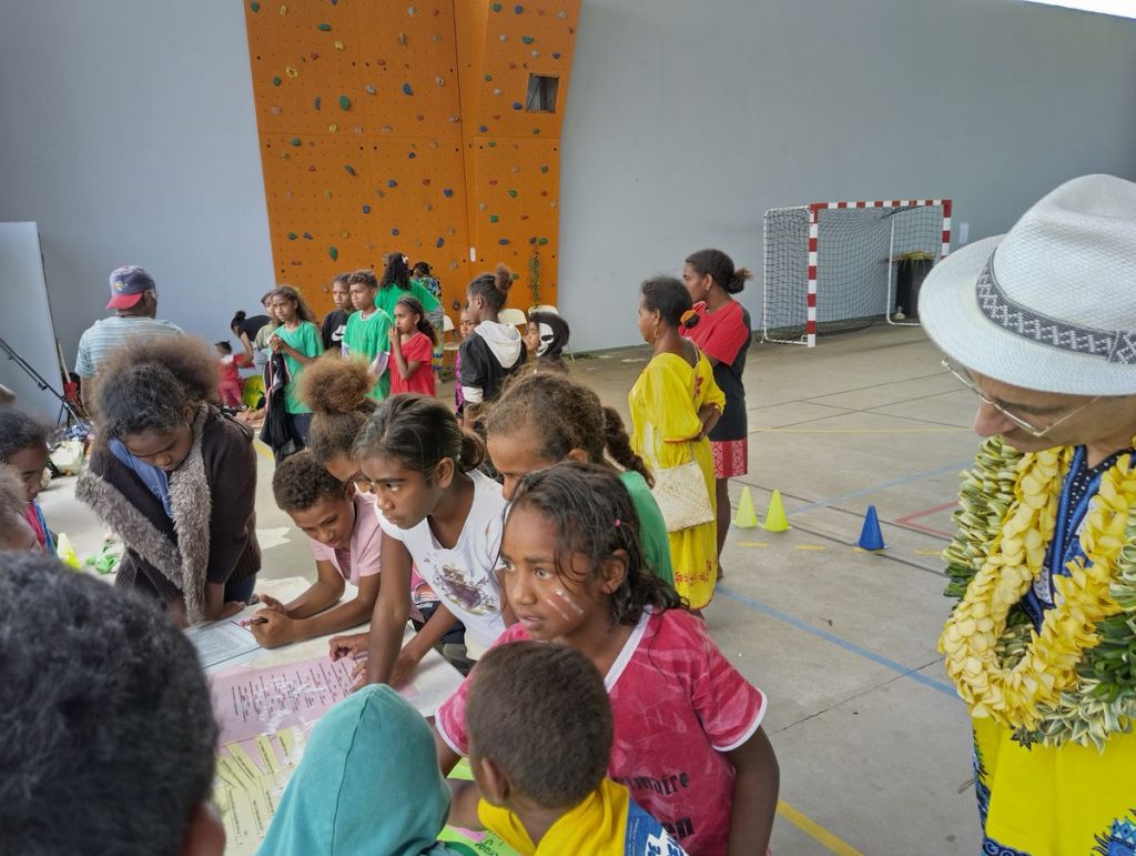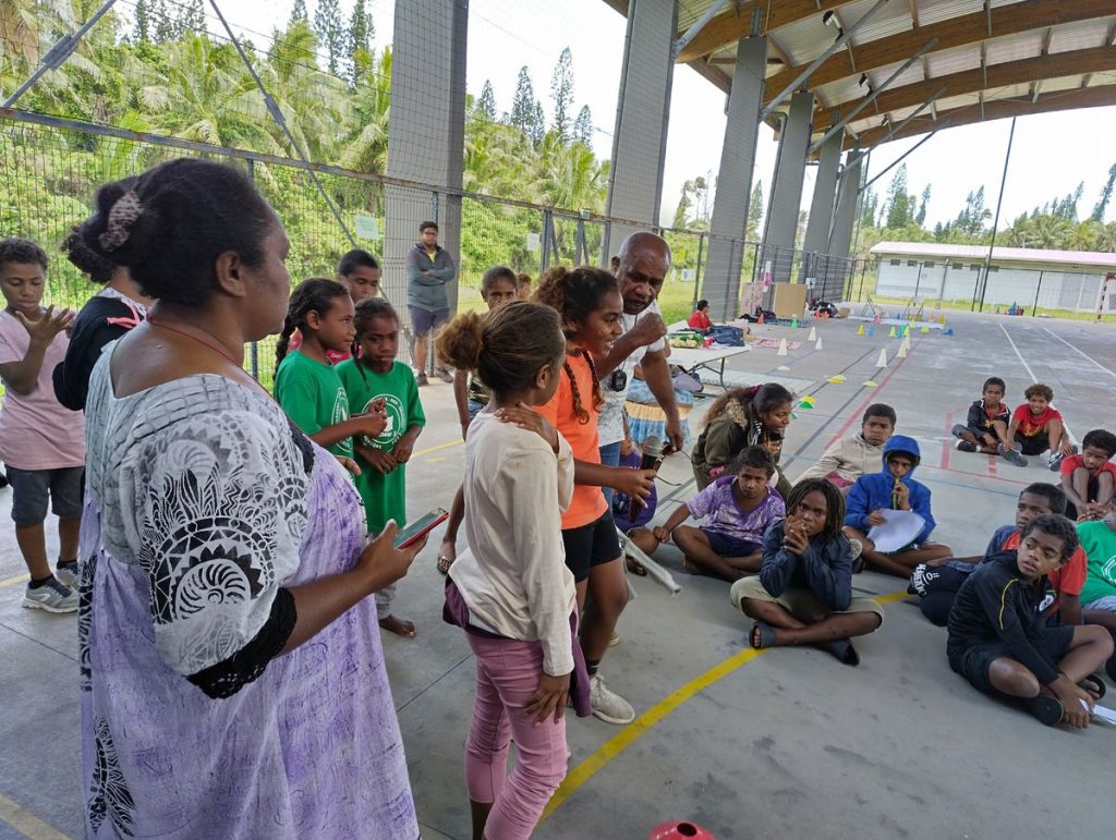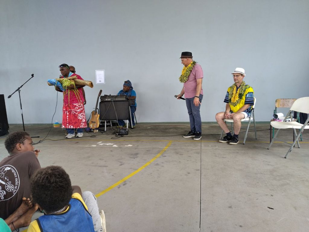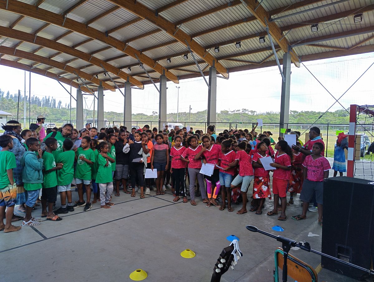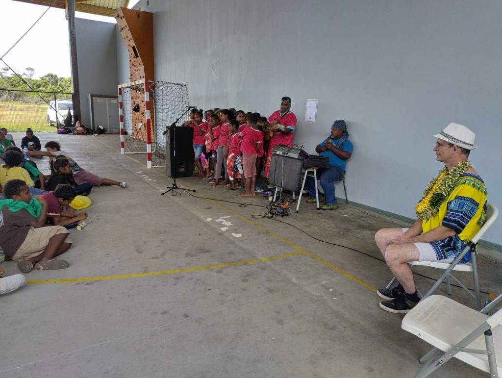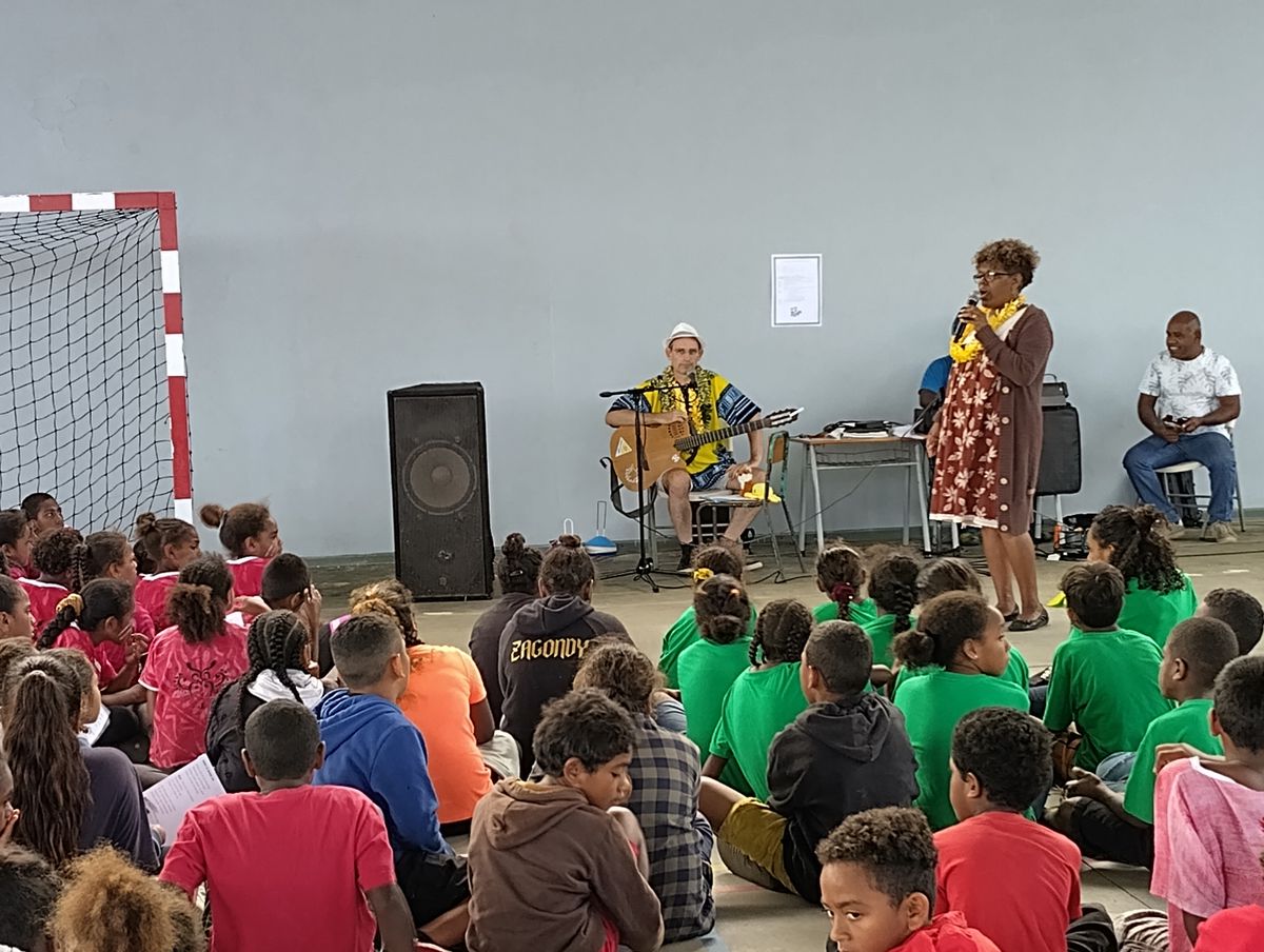 Ce vendredi matin, Paul avait donc rendez-vous avec les classes du collège public de Tadine, du collège privé de Taremen, la totalité des élèves de CM2 des quatre secteurs de l’île (enseignement public et privé)… Pas moins de 150 élèves s’étaient réunis sous la grande halle municipale de la tribu de Wabao.