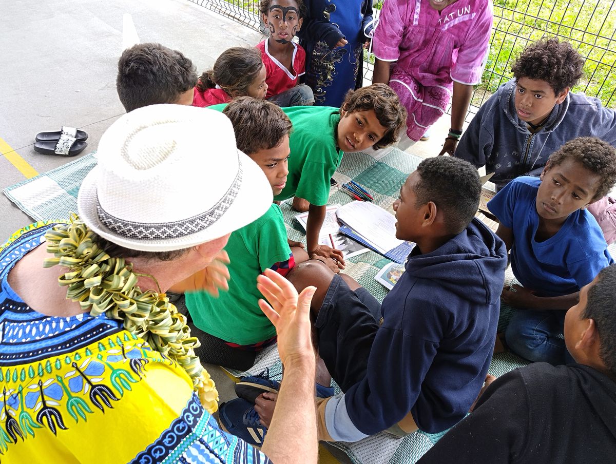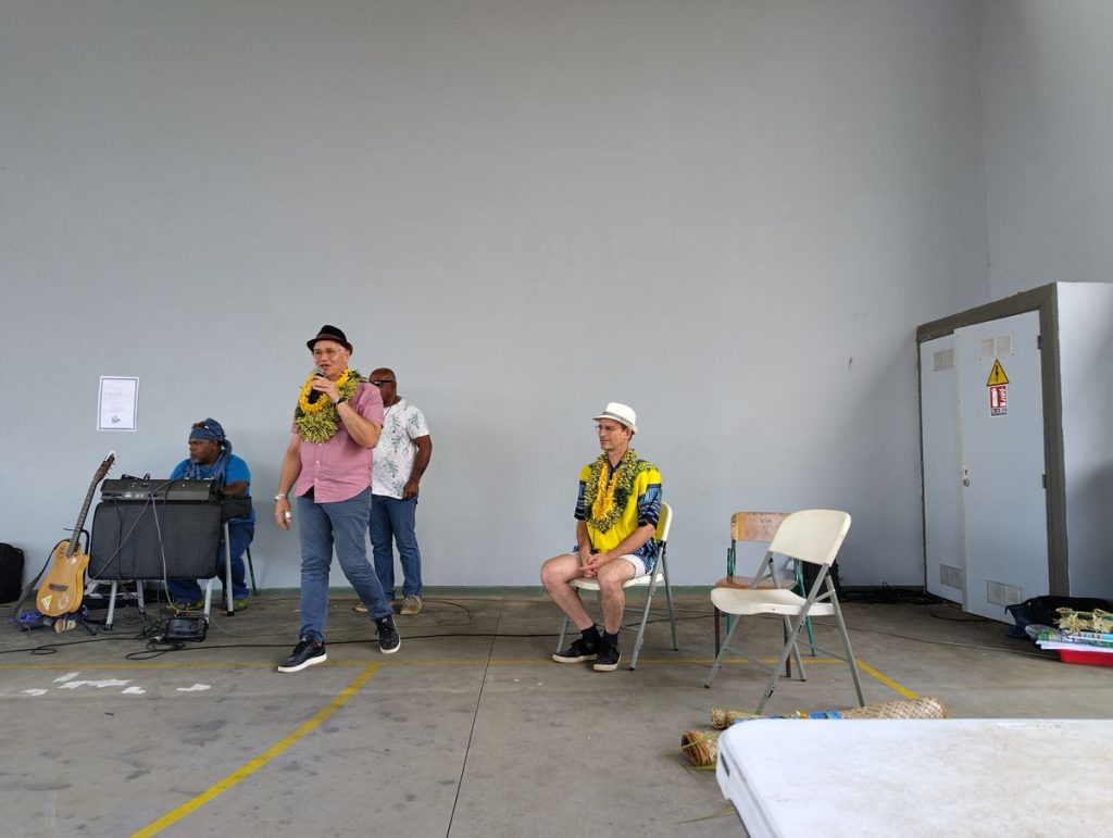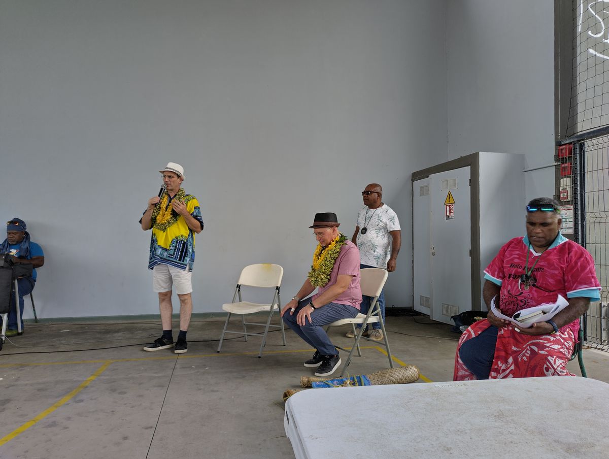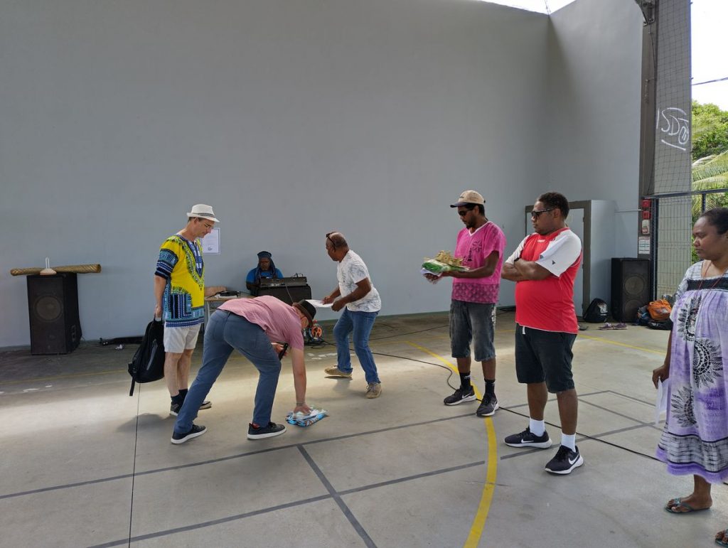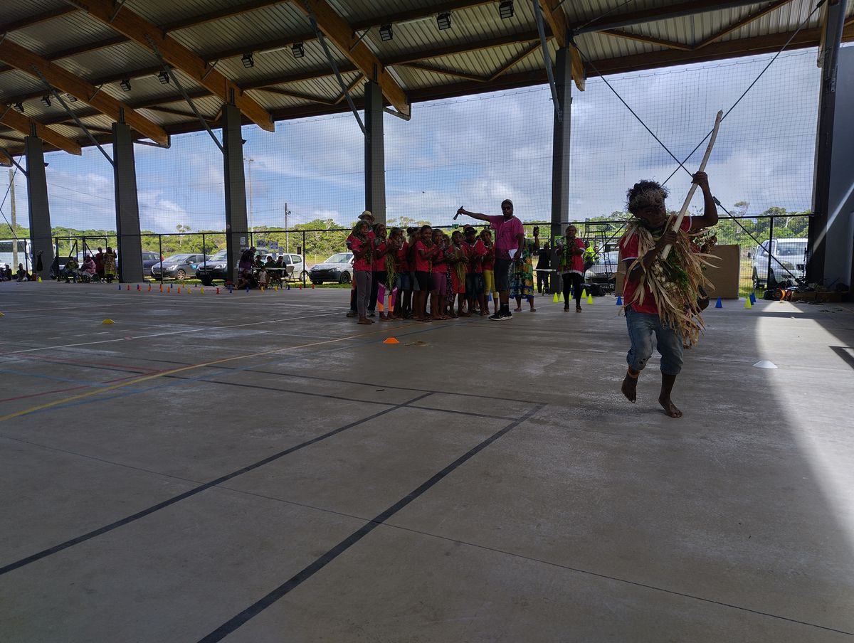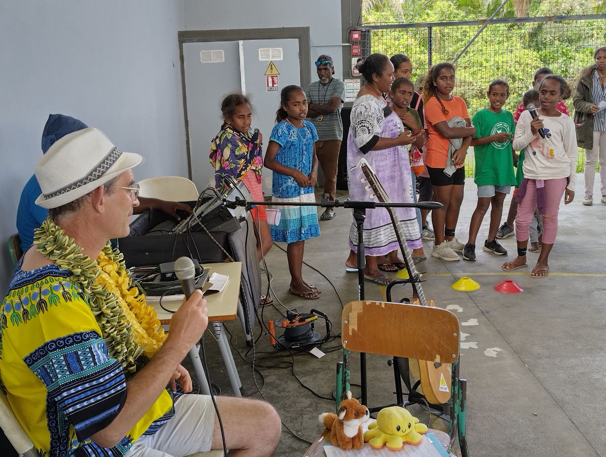 Ce vendredi matin, Paul avait donc rendez-vous avec les classes du collège public de Tadine, du collège privé de Taremen, la totalité des élèves de CM2 des quatre secteurs de l’île (enseignement public et privé)… Pas moins de 150 élèves s’étaient réunis sous la grande halle municipale de la tribu de Wabao.