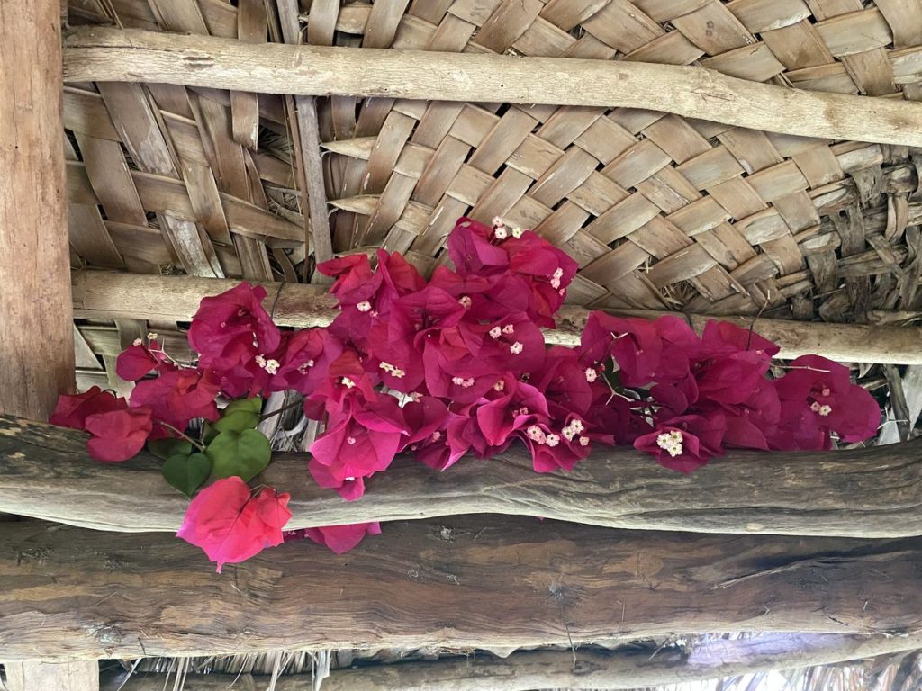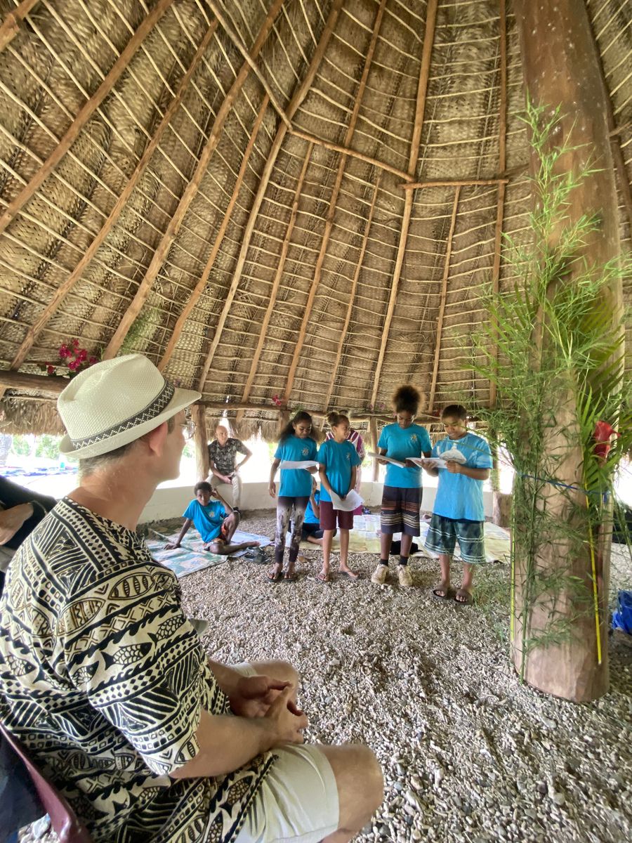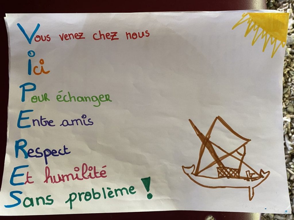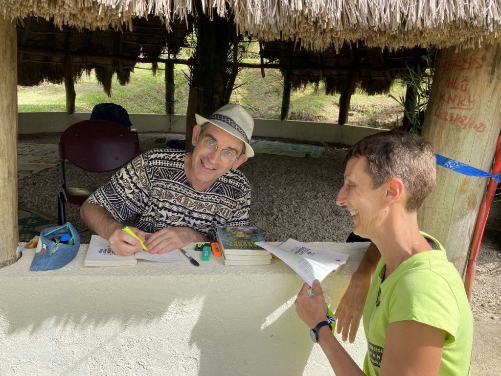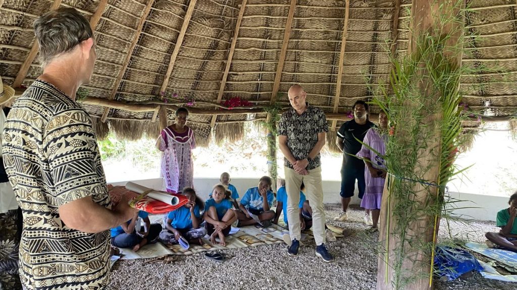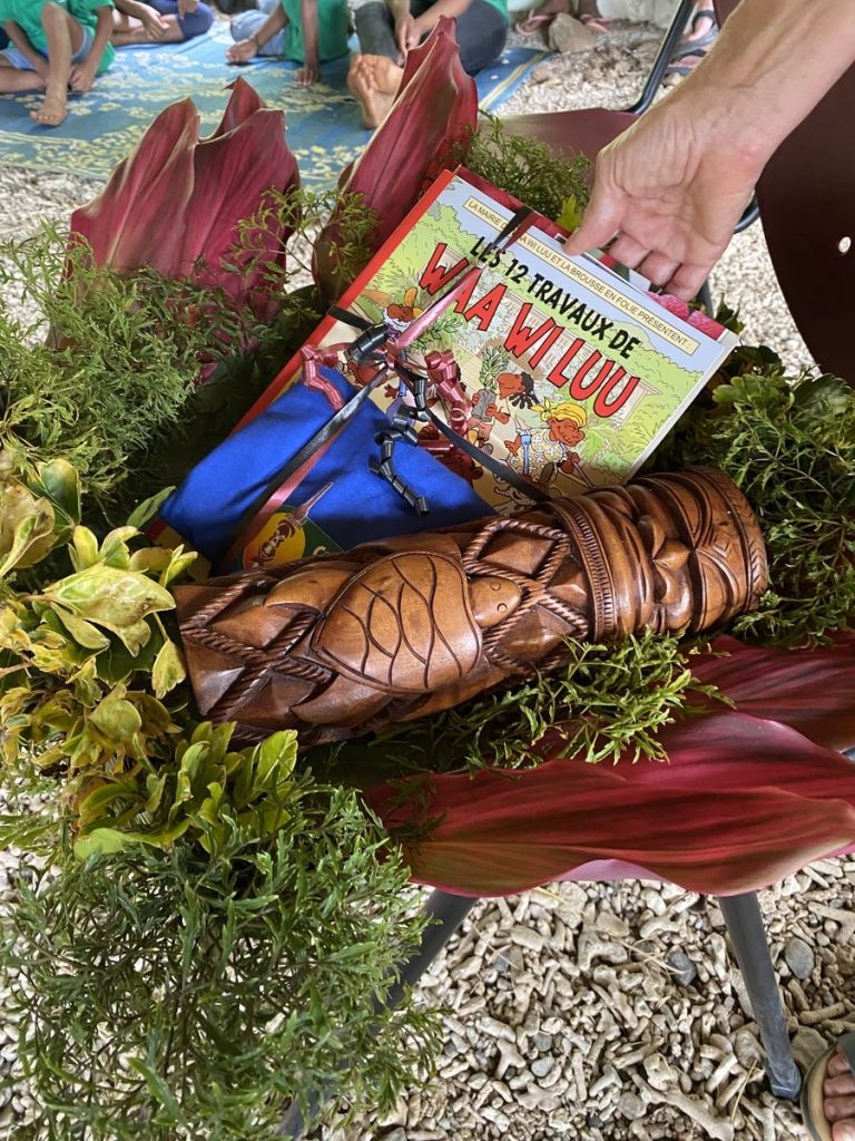 Sous la case de la mairie, échange de coutume entre Paul et le principal monsieur Richard Arnaud avec le petit message personnel de l’une de nos accompagnatrices, Marie-Laure, qui a passé son enfance à Houaïlou.
