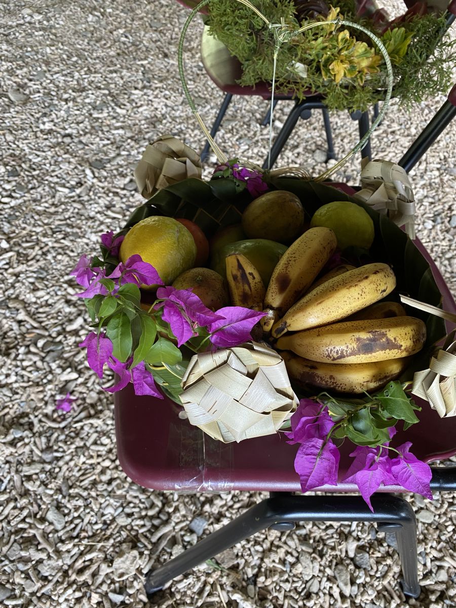Deux superbes paniers tressés, l’un empli de fruits tropicaux, l’autre de cadeaux (tee-shirt du collège, sculpture, livres) sont offerts à Paul.