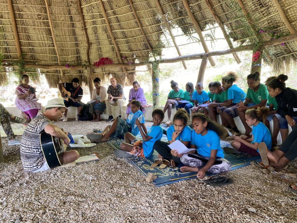 Le chant du collège de Wani est chanté avec un accompagnement à la guitare par le professeur de musique Fabrice KAJAN.