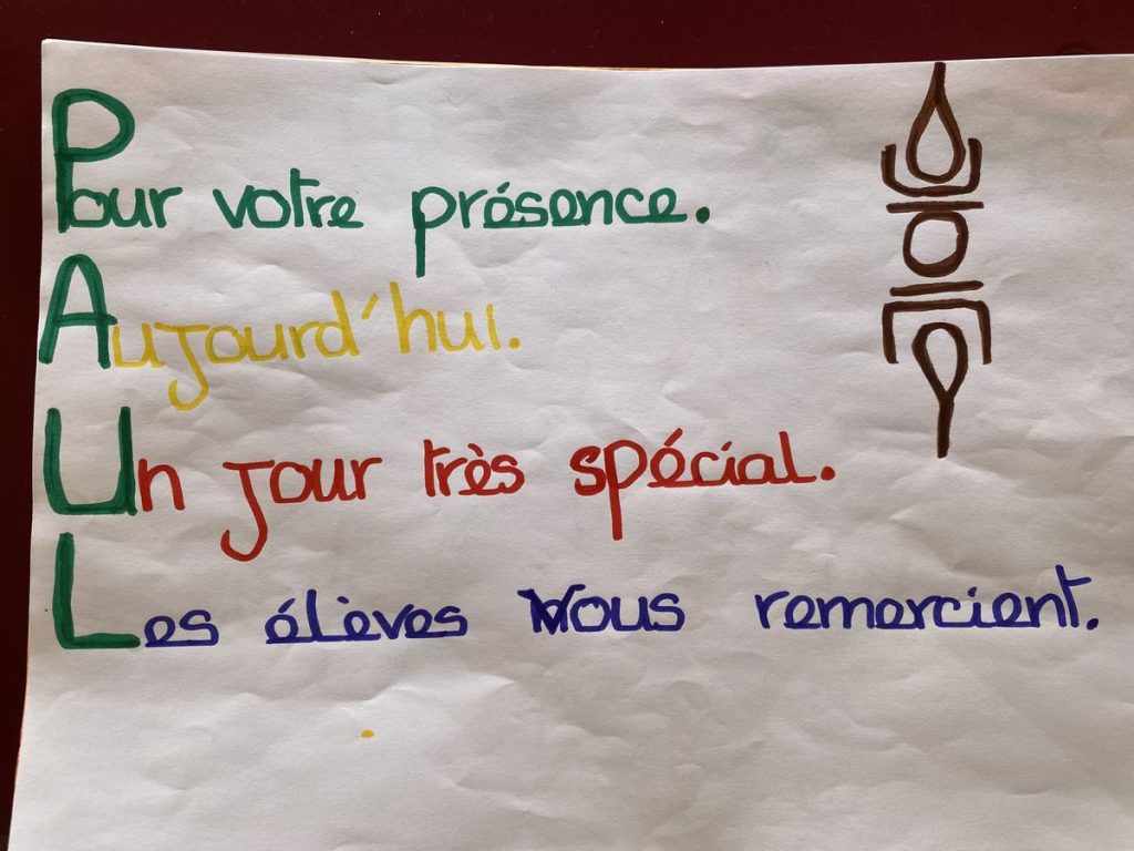 A Wani, Paul est accueilli par les élèves de CM2 et de 6 ème ayant participé au concours de lecture à voix haute.