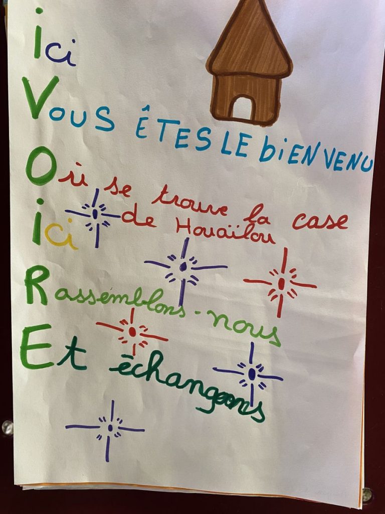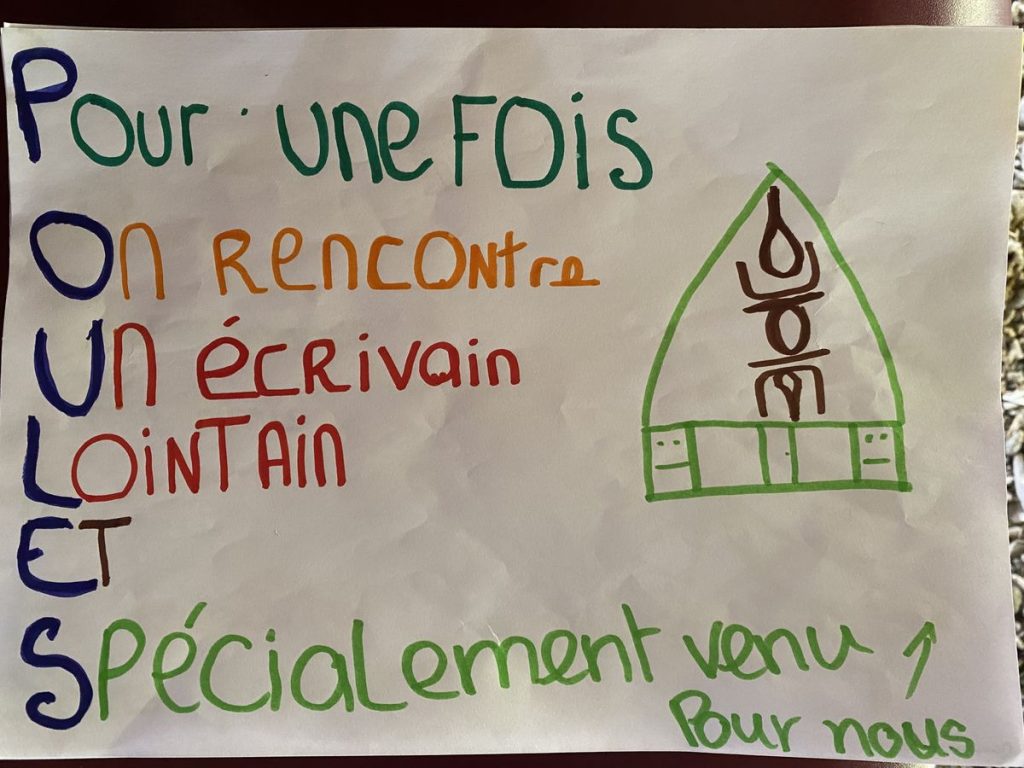 Il y a de la magie dans ce moment : venu de l’autre bout du monde, grâce à « livre, mon ami » un auteur de roman vient partager une lecture à haute voix, sous la case, à des élèves de Wani. Sous son charme !