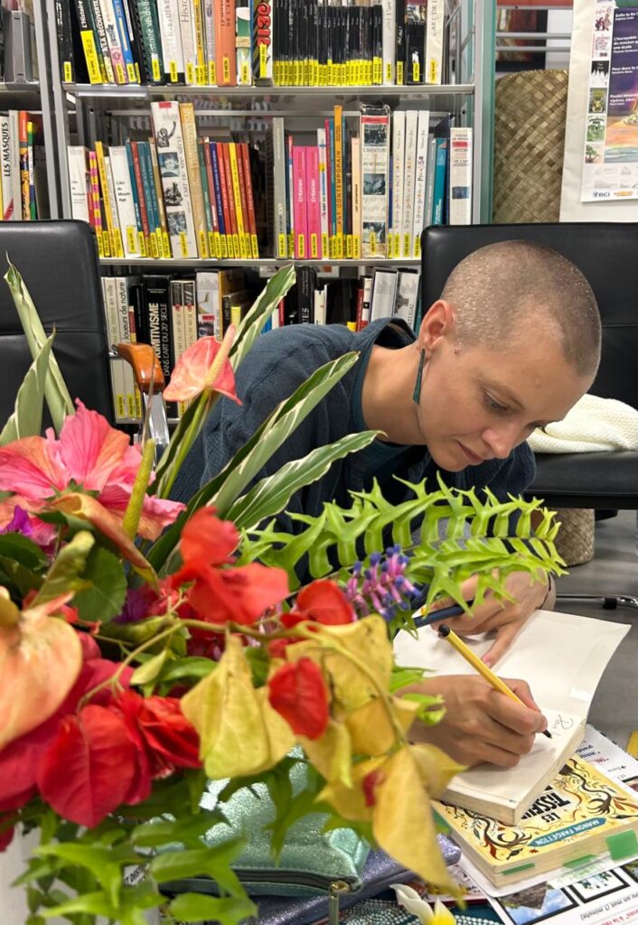 Accueillie à la médiathèque par des chants océaniens, elle a pu répondre à des questions, écouter des lectures chorales, participer à des ateliers d’écriture, rencontrer des spécialistes de la NC (historien, linguiste, gastronome et conteur), échanger avec quelques personnages de son livre qui avaient des questions à lui poser, et enfin, finir par un texte lu droit dans les yeux !