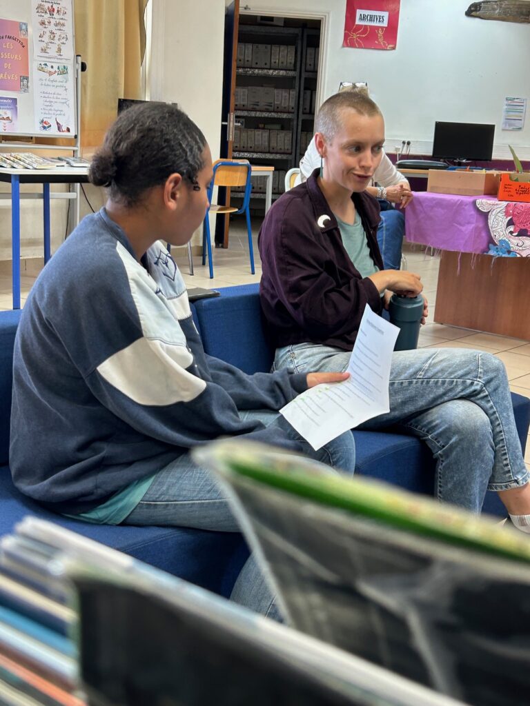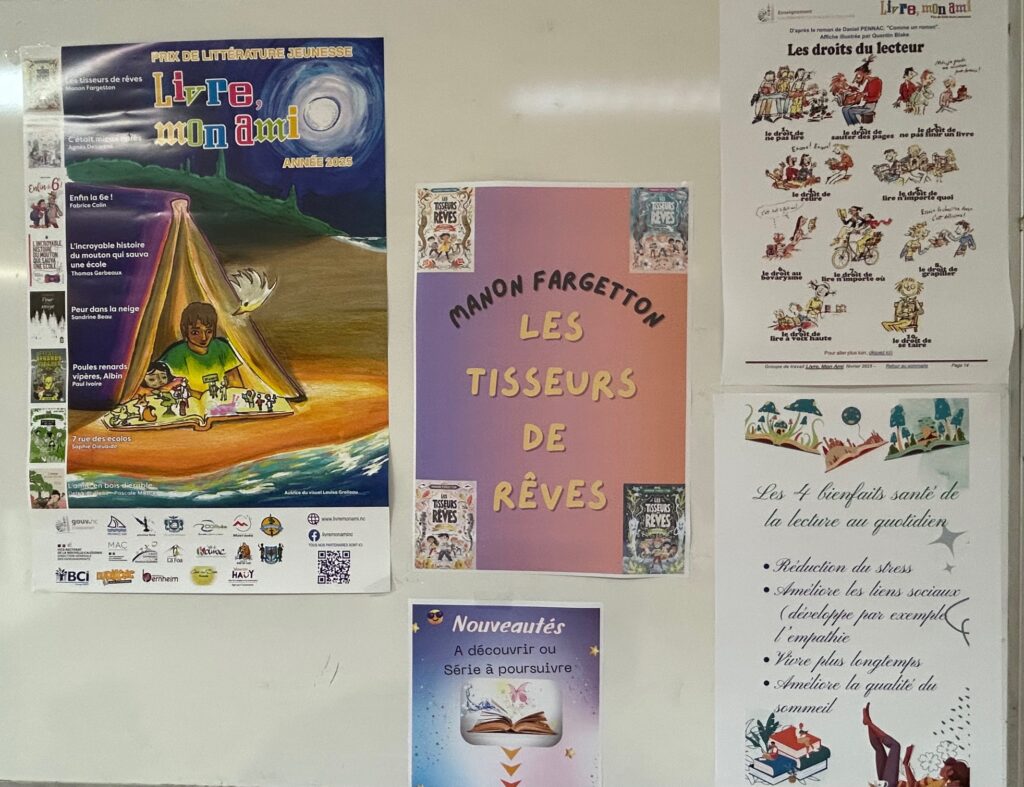 Au collège de Paita, Manon après l’accueil par la principale adjointe a été reçue au CDI par Mégane Friant, Mme professeure de français et Mme Véronique Saint-Marc la documentaliste et la classe de 604.