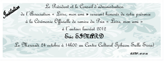 - La remise du prix « Livre Mon Ami 2012 » au lauréat aura lieu, comme depuis de nombreuses années, au Centre Culturel Tjibaou (salle Sissia), le mercredi 24 octobre à partir de 14 heures. Entrée libre mais il est bienvenu de réserver au 27 87 86.