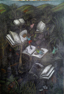 C’est là qu’est née l’affiche finale, avec des enfants en pleine lecture, s’élevant par-dessus la crête de nos montagnes, où poussent nos fameux Araucaria, reconnaissables entre tous. Et puis cela colle bien avec l’idée que la lecture est un moyen pour tous, et d’autant plus pour la jeunesse, de s’évader, de s’envoler loin, de prendre de la hauteur et de s’élever intellectuellement.
