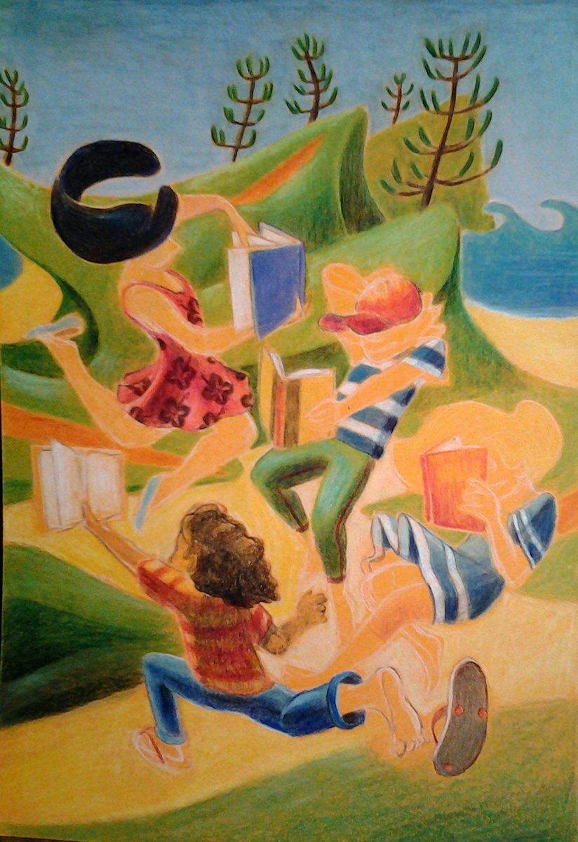 Mais cela me semblait trop confus, une affiche doit être percutante, avec moins d’éléments « perturbateurs ». J’ai fait donc le deuil de mes plantes adorées, pour me concentrer sur le sujet principal, les acteurs qui donnent corps à l’opération « Livre, mon ami », à savoir les enfants. Vous avez donc le deuxième essai qui contient l’essence de l’affiche finale, à savoir les enfants plongés en pleine lecture, tout en étant actifs, remuant, sautant. Je n’ai pas été au bout de cet essai car tant qu’à être remuant, bondissant, autant les faire sauter haut, très haut dans le ciel, jusqu’à les faire s’envoler.