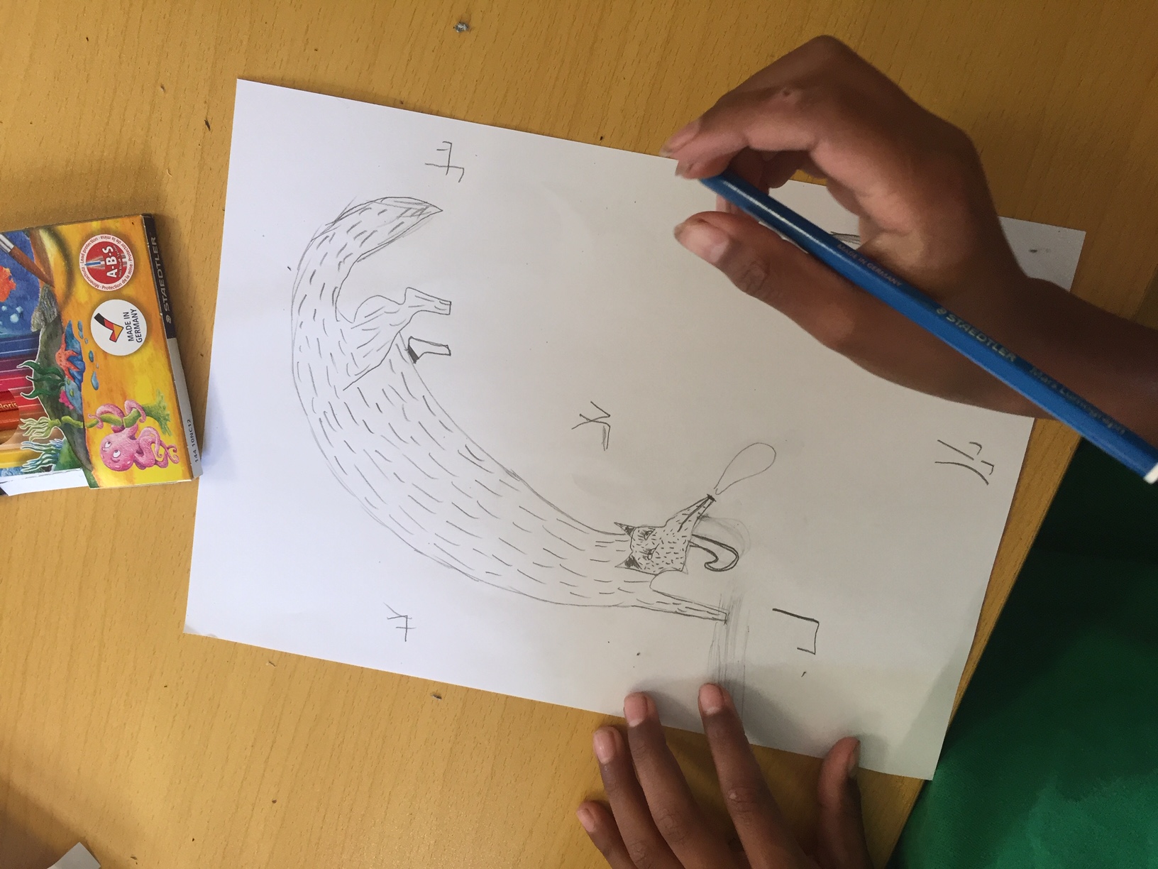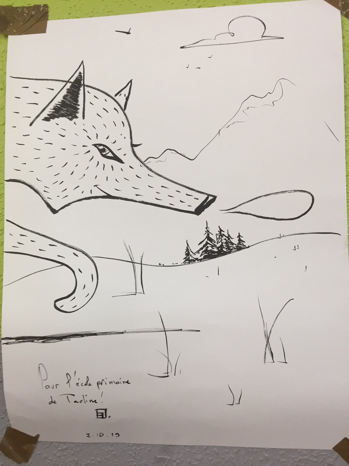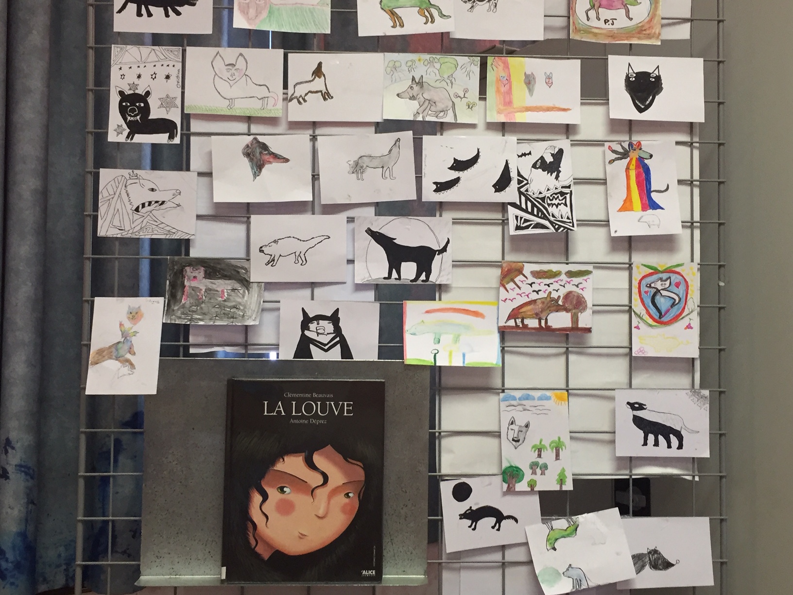 Un petit atelier dessin a suivi : Antoine a expliqué le coup de crayon nécessaire pour croquer le personnage de Romane : avoir le doigté léger avec le crayon … Petit à petit, à partir d’un rond, d’un triangle, d’arrondis et de traits en traits, sont nées plusieurs Romane puis plusieurs louves.