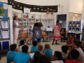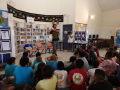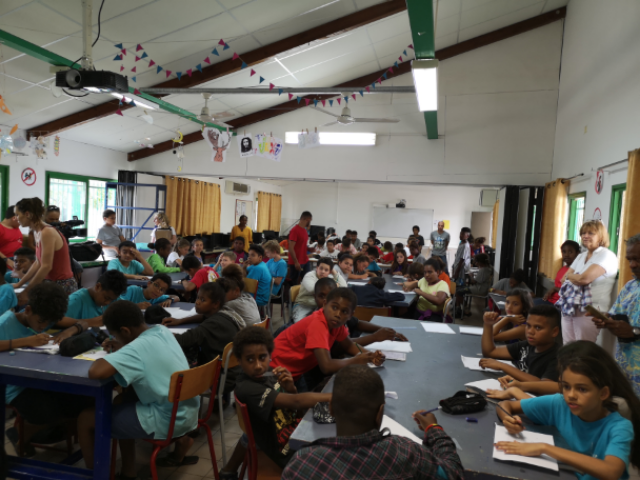Les élèves du CM2 de l’école de Poum avaient fait le voyage jusqu’à Koumac : ils ont accueilli ANTOINE en chanson accompagnés de leur enseignante à la guitare avant d’échanger avec lui sur le métier d’illustrateur .
