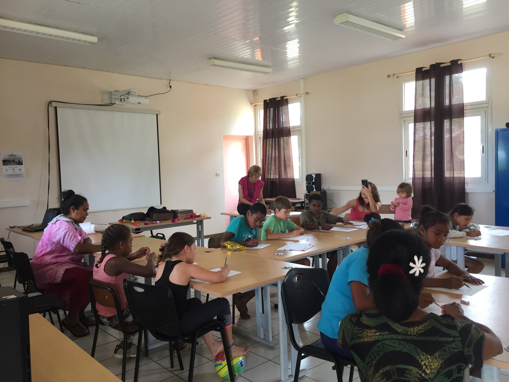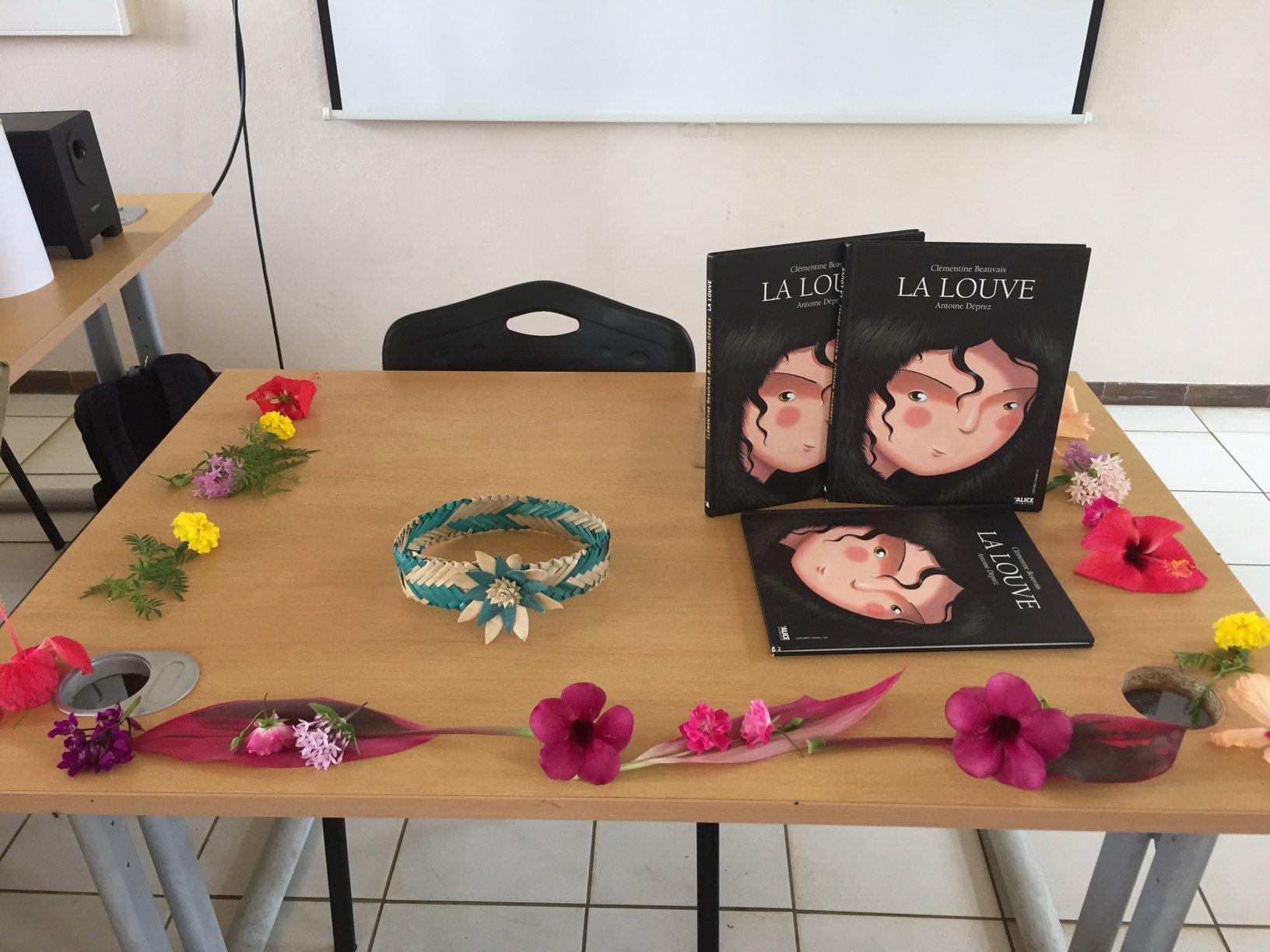 Quelques élèves de CM1/CM2 étaient présents à l’école avec Marie-Laure et Jacqueline, leurs enseignantes pour préparer un spectacle sur les contes classiques revisités à la mode des îles. Antoine a présenté son métier et les illustrations de l’album « La louve ».