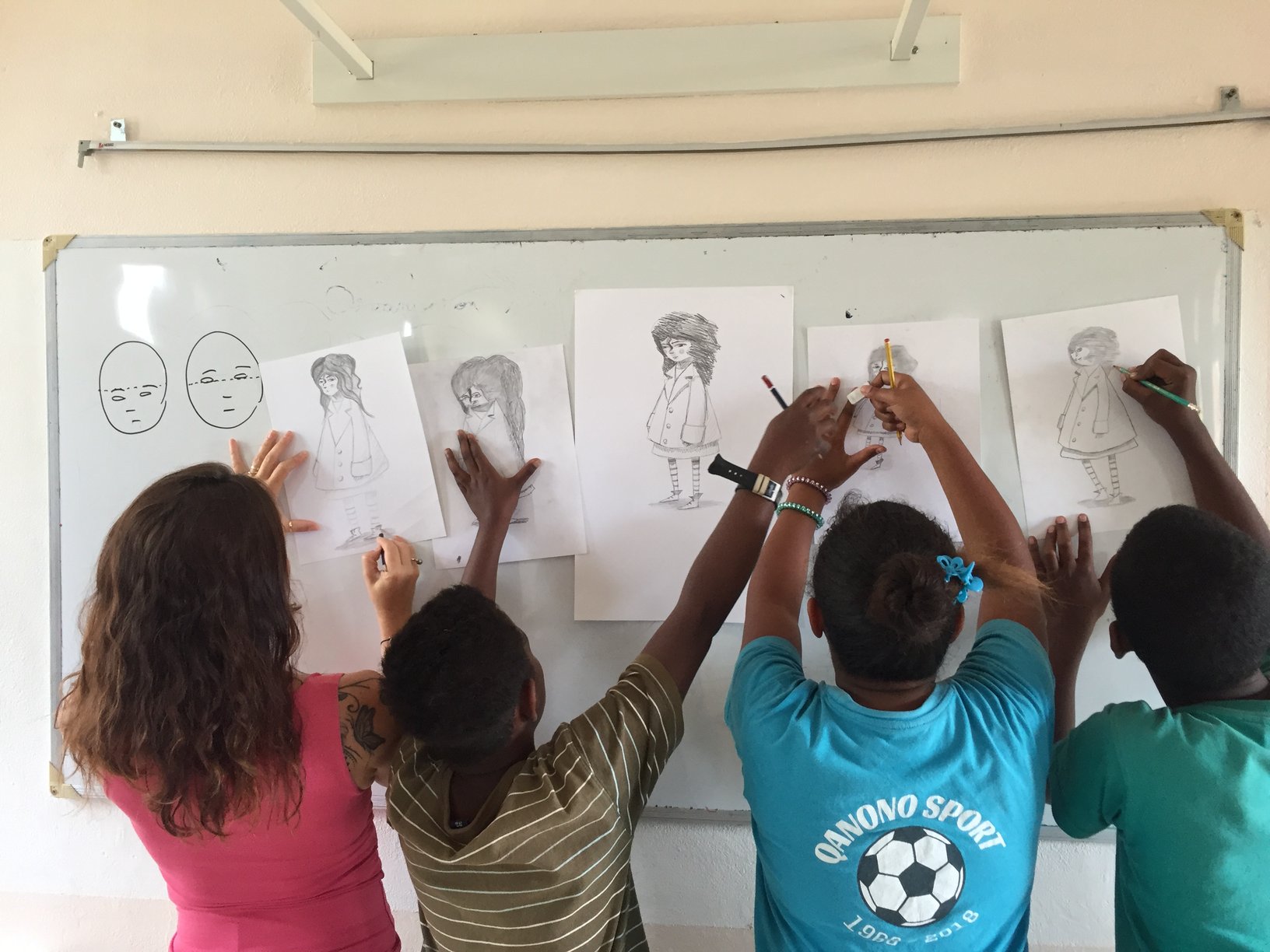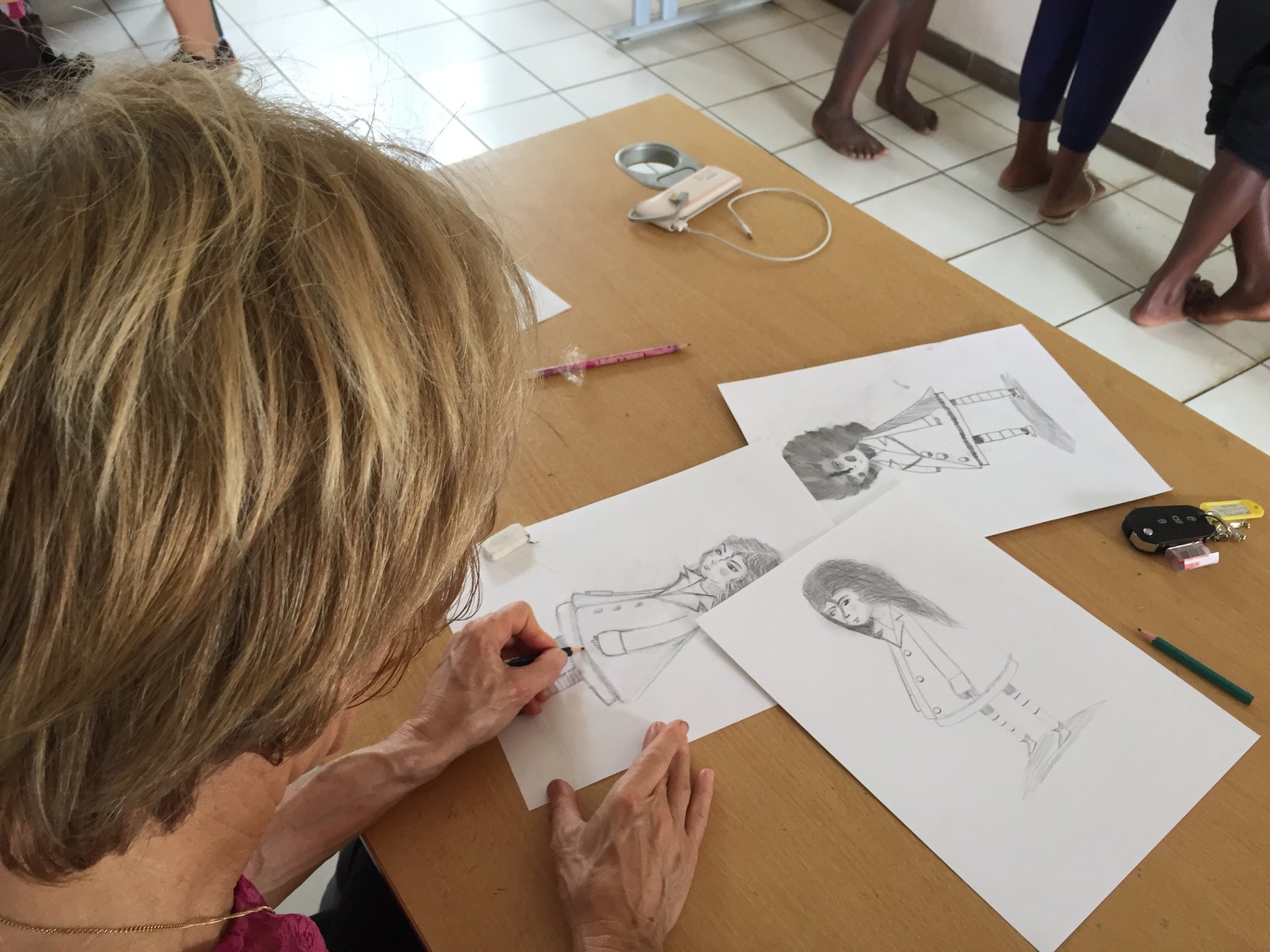 Les adultes, les enseignantes, Agnès et Wally, une ancienne directrice, ont aussi participé au cours de dessin, heureuses de réussir leurs portraits.