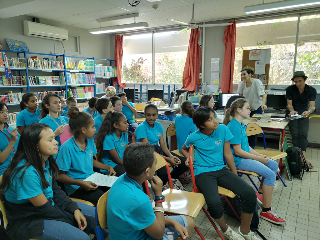 Antoine passe un premier quart d’heure en classe avec les élèves de 3e prépa pro qui présentent leur recueil de nouvelles autour des sons et sensations liés à un souvenir. Il rencontre ensuite la 6e4 de madame Menard au CDI.