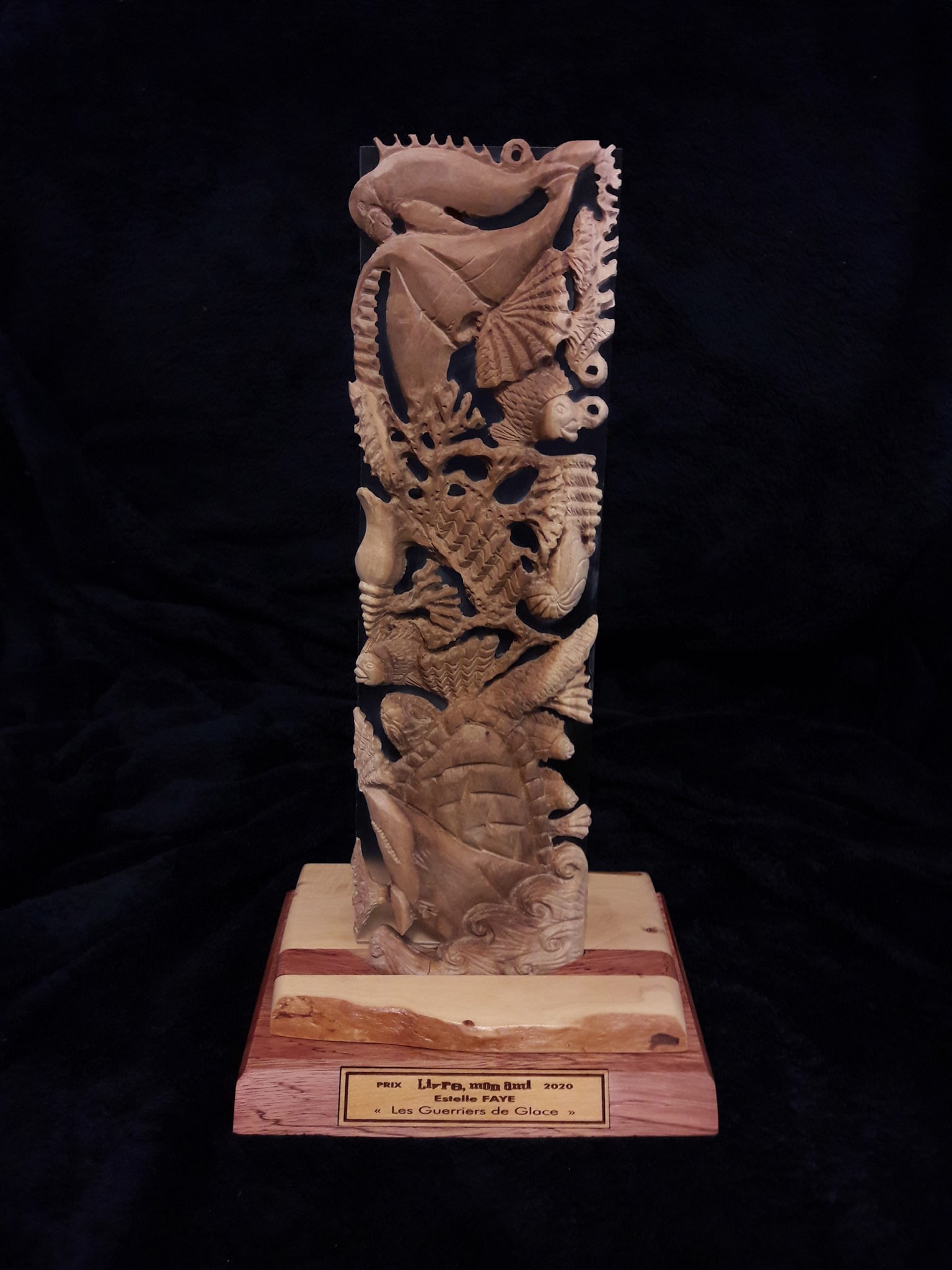 | À propos du trophée Le trophée a été réalisé par Audrey Yeshua. C’est une sculpture en bois de santal, en provenance des îles Loyauté (probablement d’Ouvéa). Le bois de Santal est une essence très odorante. En savoir plus sur l’artiste : http://www.boutiques-artisanales.com/Yeshua.htm |