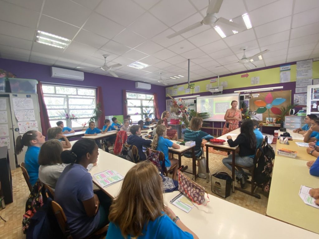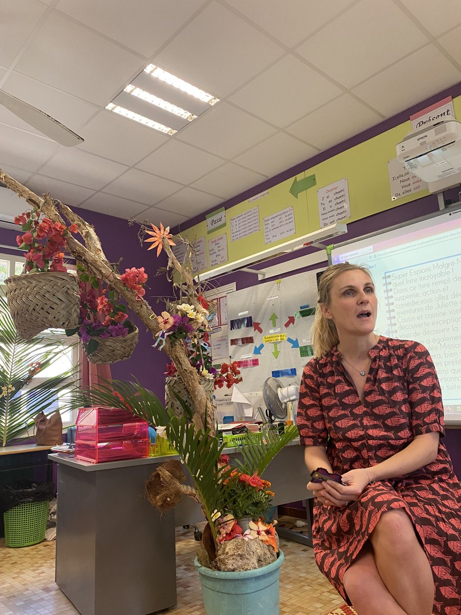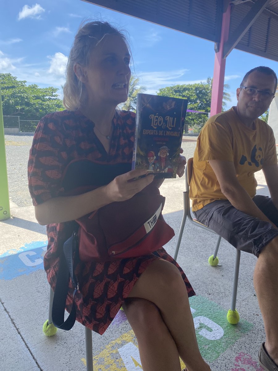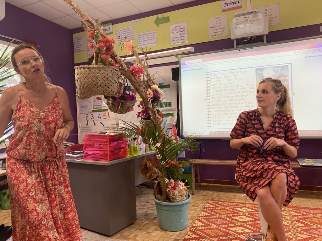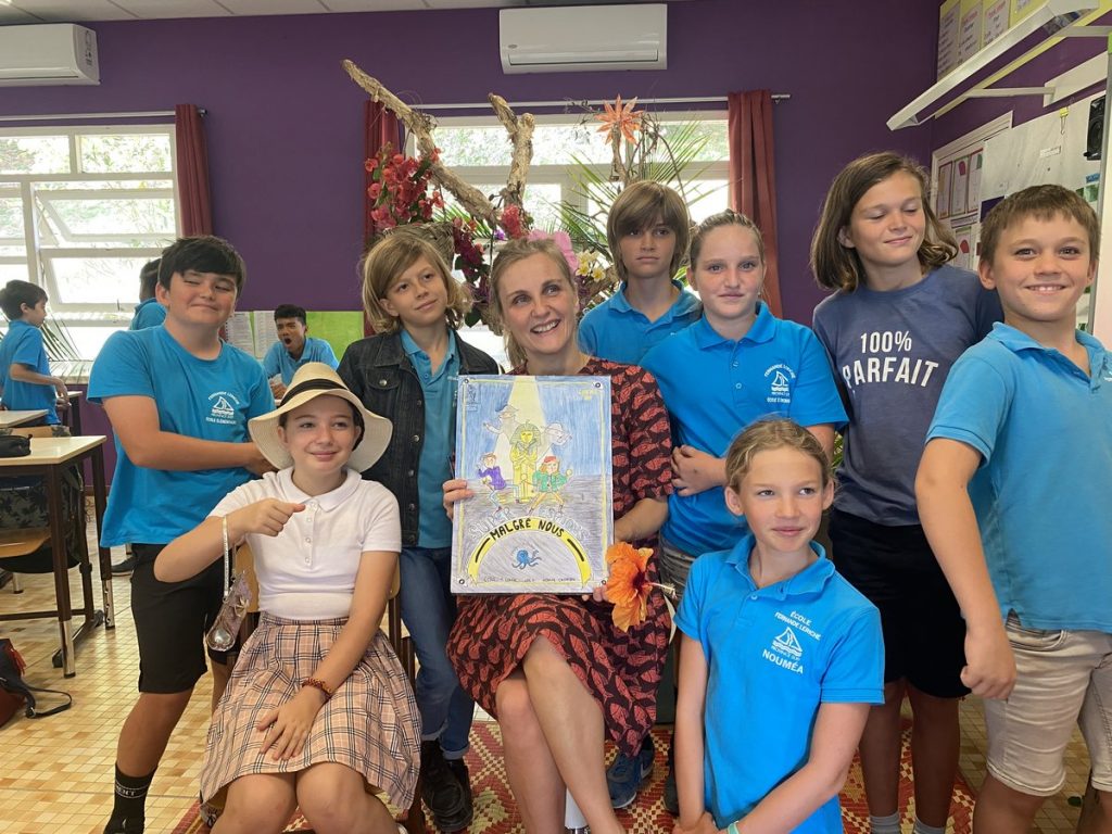 Chez Maîtresse Stéphane à l’école Fernande Leriche de Nouméa, dans une classe fleurie et embaumant le parfum des frangipaniers en fleurs, une première rencontre fabuleuse : plusieurs mises en voix d’extraits bien choisis du roman de Christine « Supers espions -malgré nous- » quelques saynètes charmantes (l’arrivée à la gare, les noms secrets des espions), la présentation d’un cahier multimédia créé par Eléonora, jeune élève italienne bilingue.