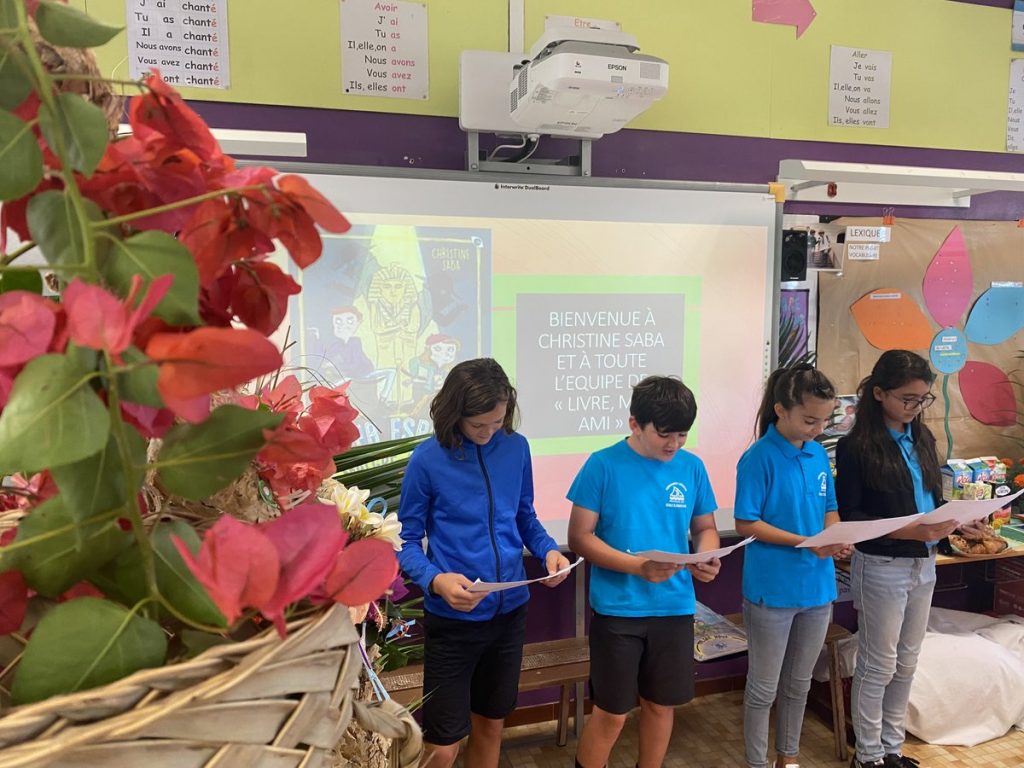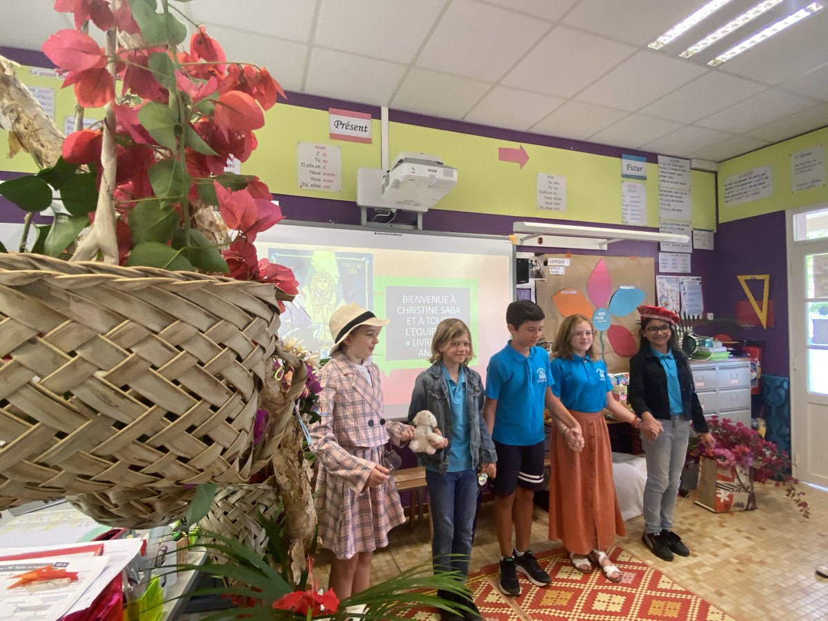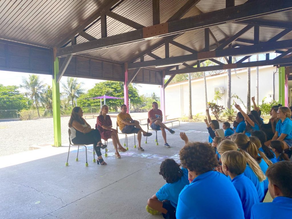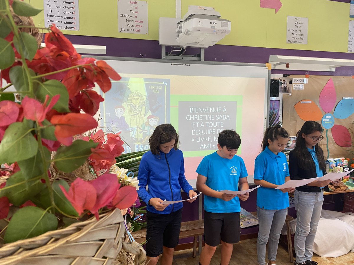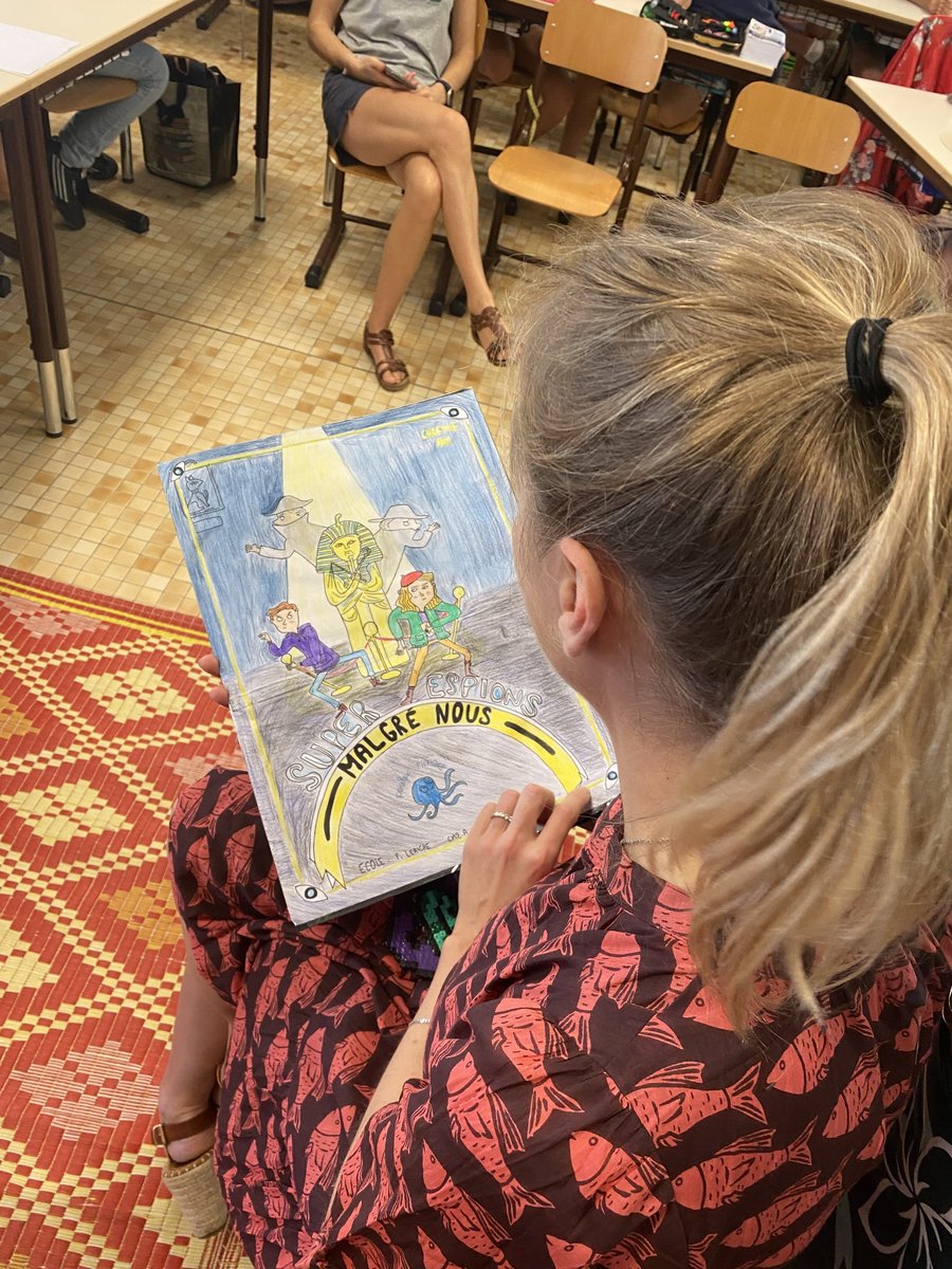 Chez Maîtresse Stéphane à l’école Fernande Leriche de Nouméa, dans une classe fleurie et embaumant le parfum des frangipaniers en fleurs, une première rencontre fabuleuse : plusieurs mises en voix d’extraits bien choisis du roman de Christine « Supers espions -malgré nous- » quelques saynètes charmantes (l’arrivée à la gare, les noms secrets des espions), la présentation d’un cahier multimédia créé par Eléonora, jeune élève italienne bilingue.