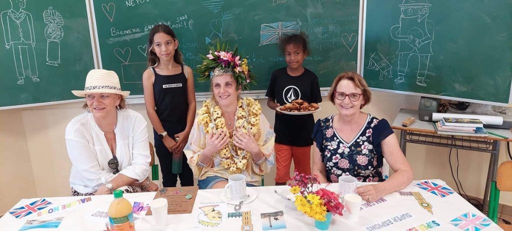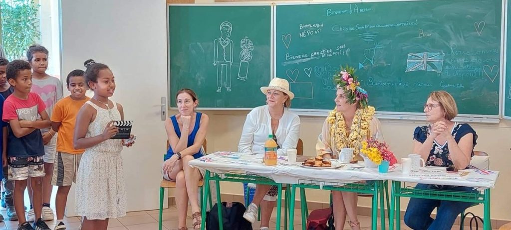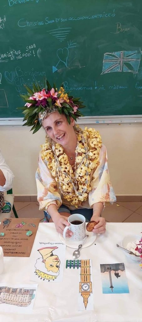 Après un accueil très océanien organisé par Gwenaëlle la directrice (colliers de fleurs et couronnes) un tea time à l’anglaise a été offert à Christine et ses accompagnatrices royalement installées à une table face au spectacle : 3 saynètes se sont enchaînées autour des moments forts du livre, suivies d’une série de questions très organisées et pertinentes, questions dont les élèves notaient au fur et à mesure les réponses.