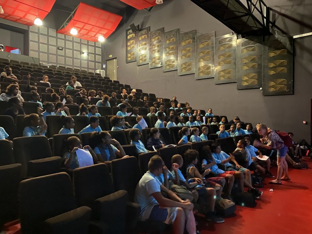 Christine a d’abord été reçue dans l’auditorium du complexe culturel de Koné (nous remercions l’équipe de l’Association de Formation des Musiciens Intervenants) par les deux classes du collège de Koné et le CM2 de l’école de l’Immaculée Conception.