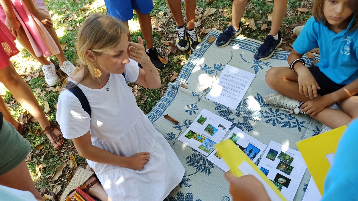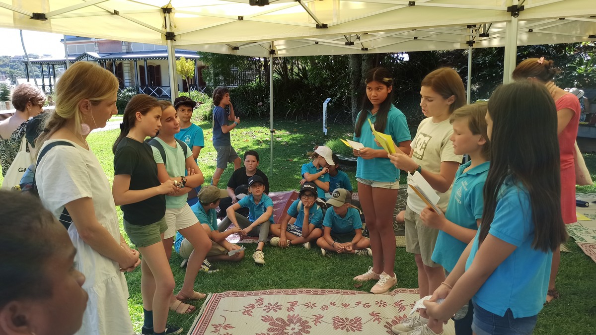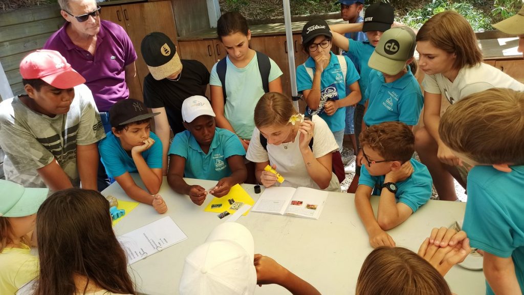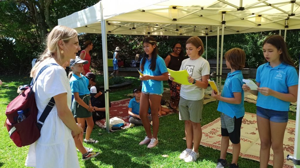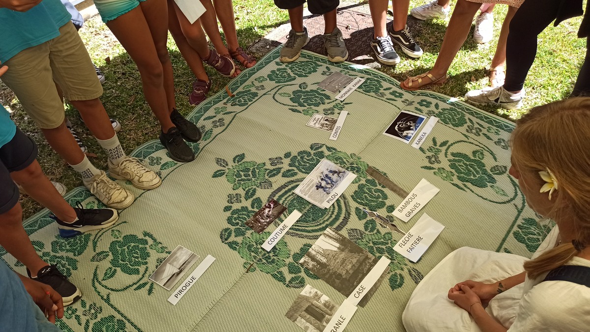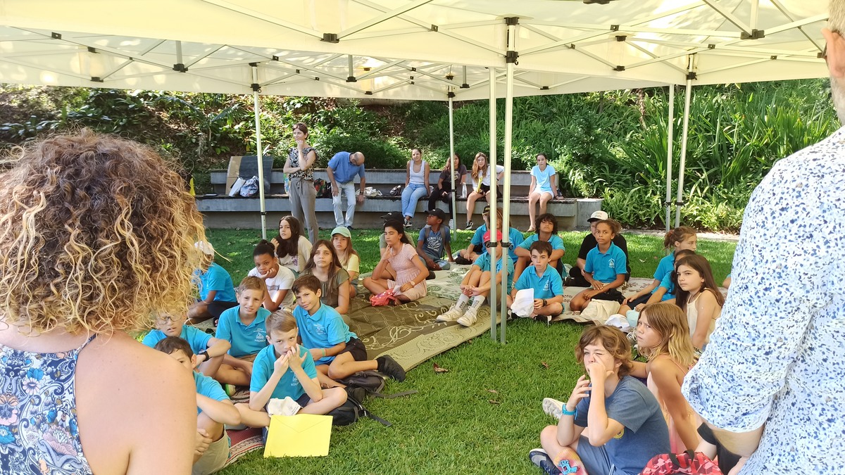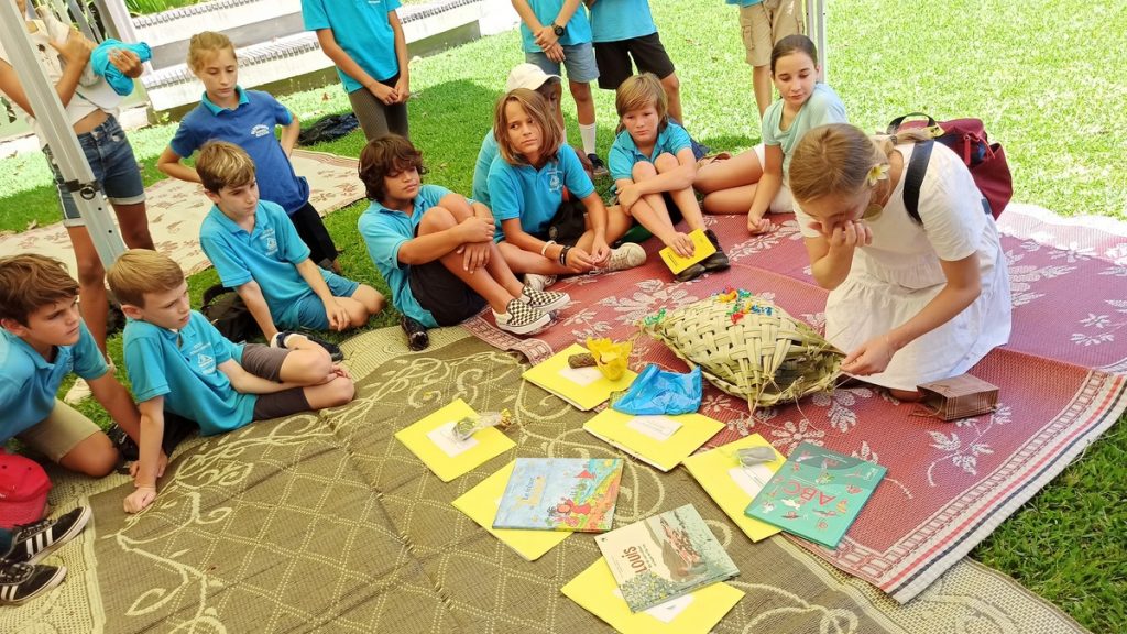 La classe de CM2 de Maîtresse Nathalie de l’école Fernande Leriche ainsi qu’une classe de 6ème du collège Mariotti accompagnée de Mme Jutteau, leur professeure documentaliste, avaient donné rendez-vous à Christine Saba au Château Hagen en cette chaude matinée de novembre pour lui proposer un jeu de piste autour de l’histoire, de la géographie, des sciences, du règne animal et végétal tels qu’ils se manifestent en Nouvelle-Calédonie. Après un accueil en chanson, on fit place à la réflexion et aux énigmes.