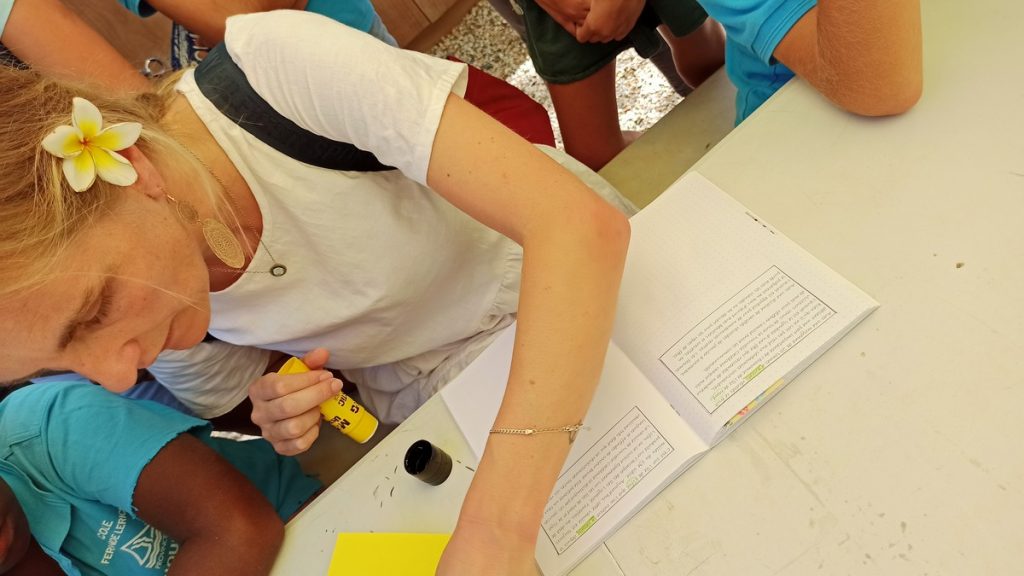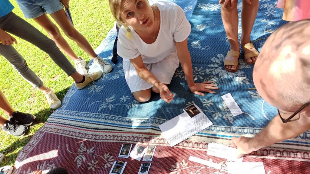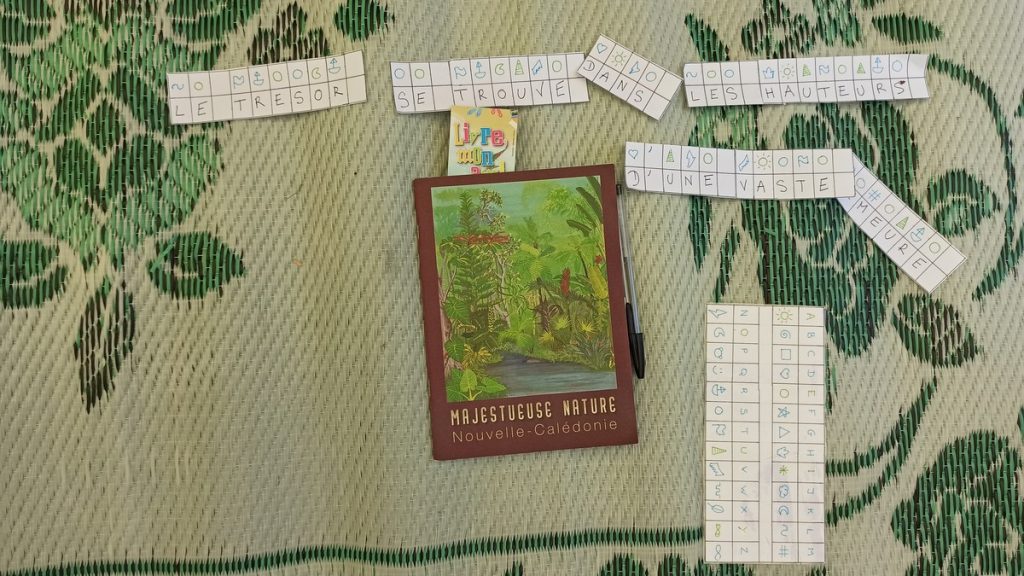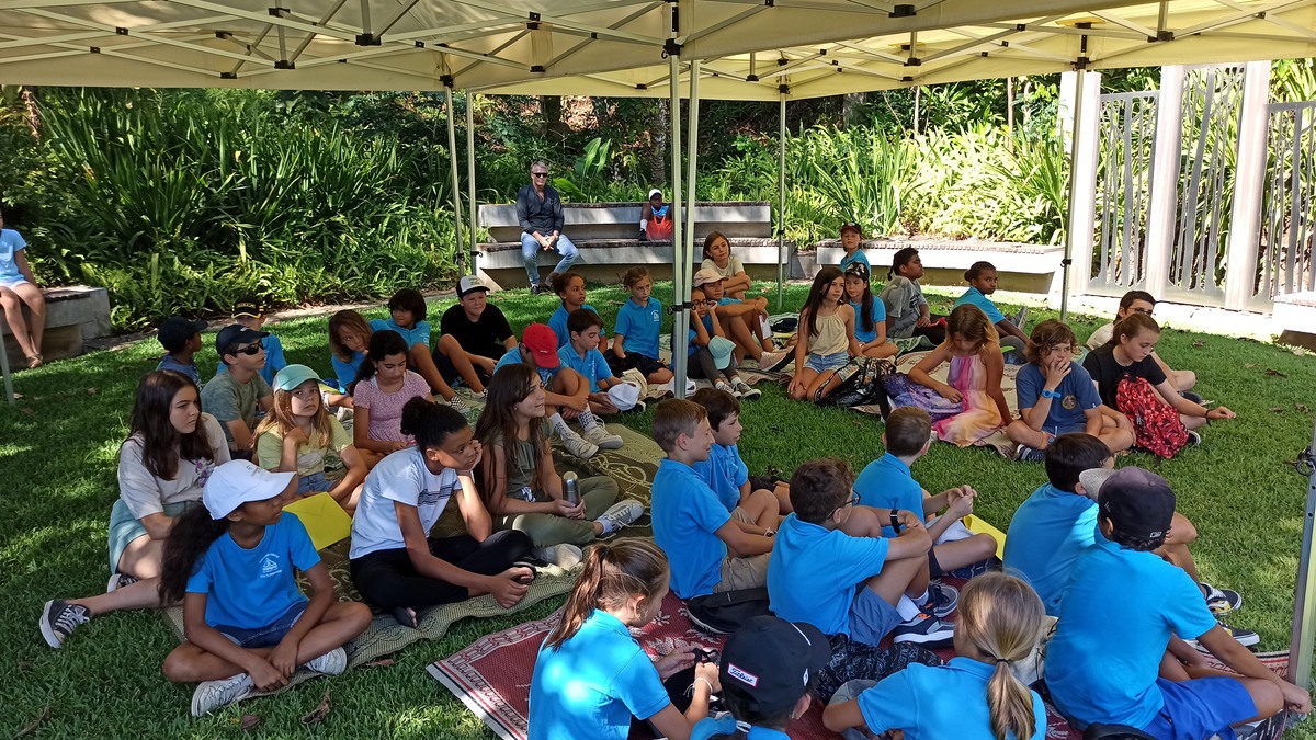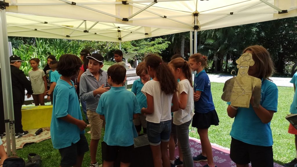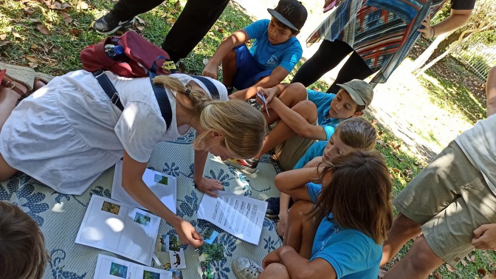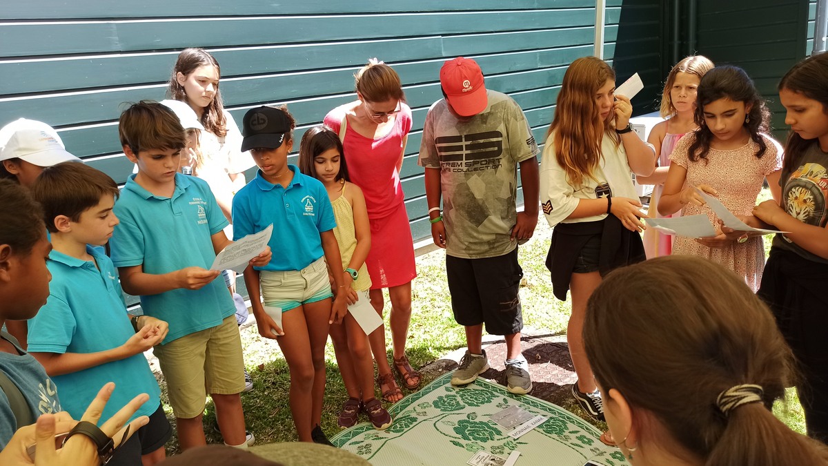La classe de CM2 de Maîtresse Nathalie de l’école Fernande Leriche ainsi qu’une classe de 6ème du collège Mariotti accompagnée de Mme Jutteau, leur professeure documentaliste, avaient donné rendez-vous à Christine Saba au Château Hagen en cette chaude matinée de novembre pour lui proposer un jeu de piste autour de l’histoire, de la géographie, des sciences, du règne animal et végétal tels qu’ils se manifestent en Nouvelle-Calédonie. Après un accueil en chanson, on fit place à la réflexion et aux énigmes.