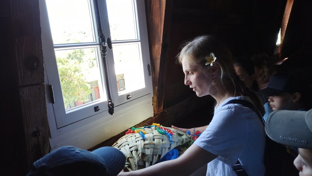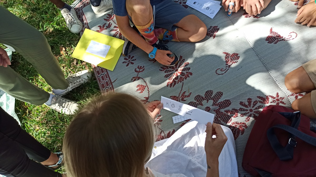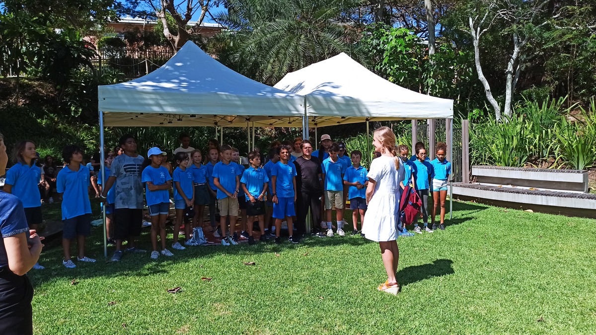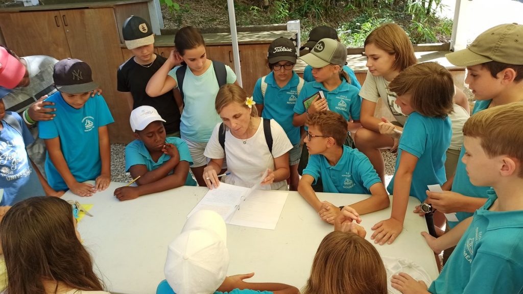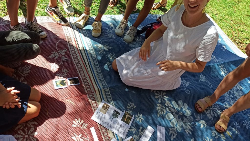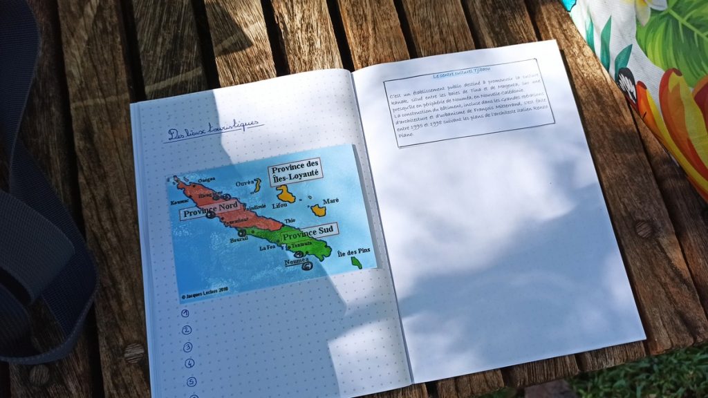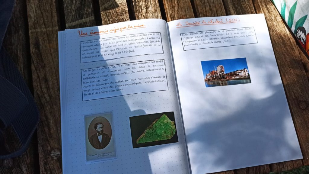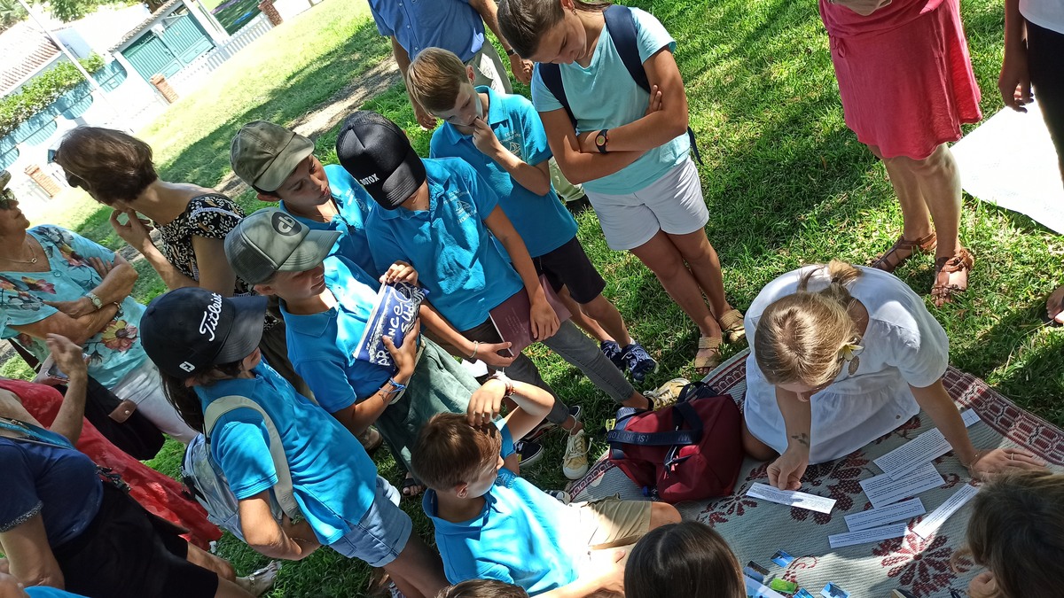 La classe de CM2 de Maîtresse Nathalie de l’école Fernande Leriche ainsi qu’une classe de 6ème du collège Mariotti accompagnée de Mme Jutteau, leur professeure documentaliste, avaient donné rendez-vous à Christine Saba au Château Hagen en cette chaude matinée de novembre pour lui proposer un jeu de piste autour de l’histoire, de la géographie, des sciences, du règne animal et végétal tels qu’ils se manifestent en Nouvelle-Calédonie. Après un accueil en chanson, on fit place à la réflexion et aux énigmes.