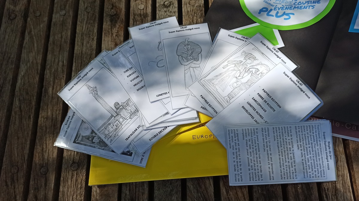 Christine a découvert avec émerveillement tous les cadeaux contenus par ce fameux panier, tous en lien avec la thématique du jeu de pistes, parmi lesquel un jeu complet des sept familles dessiné pour elle par un élève… entièrement seul !