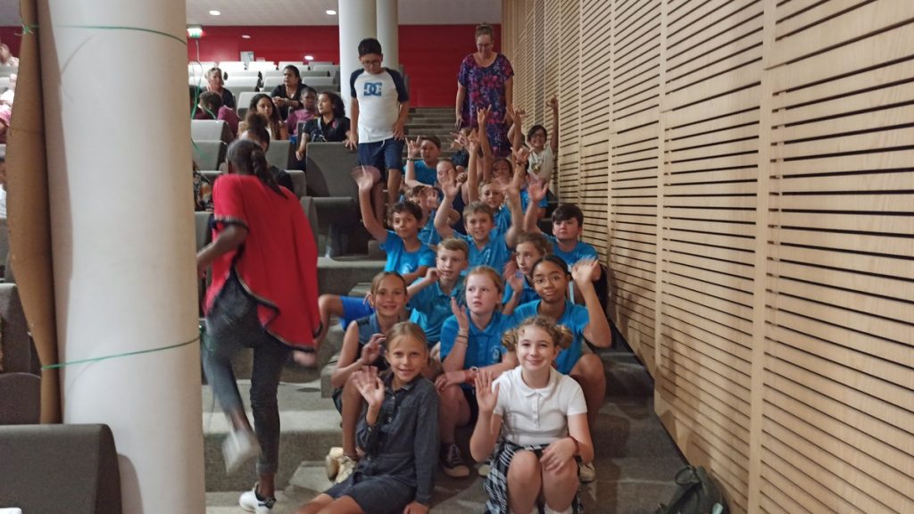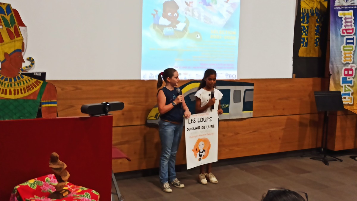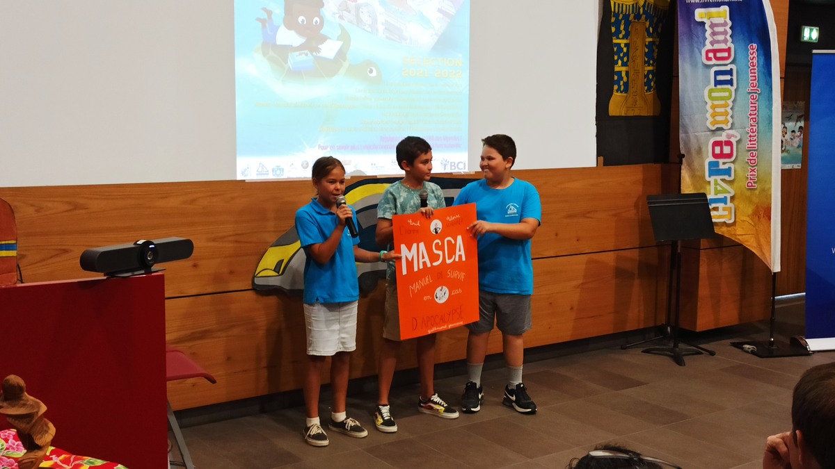 Ce sont les élèves des deux classes de CM2 de l’école Fernande Leriche, à Nouméa, qui ont eu l’honneur d’ouvrir la manifestation par un défilé d’affiches, facsimilés des couvertures de sept livres de la sélection 2021-2022. Chaque livre était présenté par un court poème, déclamé par deux ou trois interprètes.