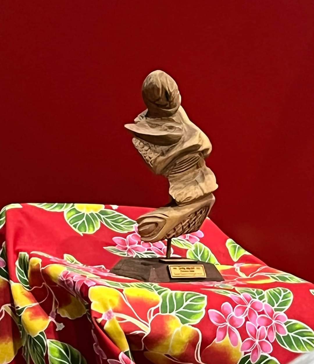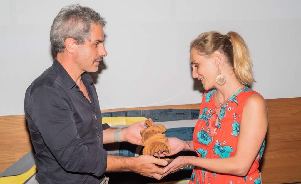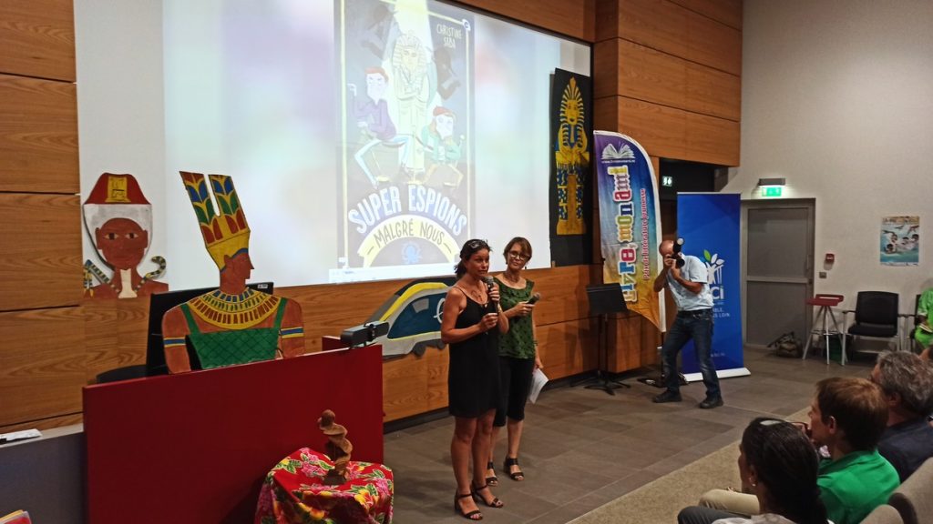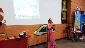 Le moment est enfin venu d’attribuer à Christine Saba son prix d’autrice lauréate pour « Super Espions (malgré nous) ». Il s’agit d’une sculpture en bois de santal réalisée par l’artiste Baptiste Bodin. Christine a livré un émouvant discours rendant compte de son expérience calédonienne « même s’il faut inventer des mots pour pouvoir le raconter ».