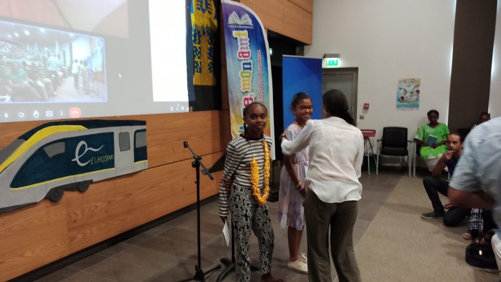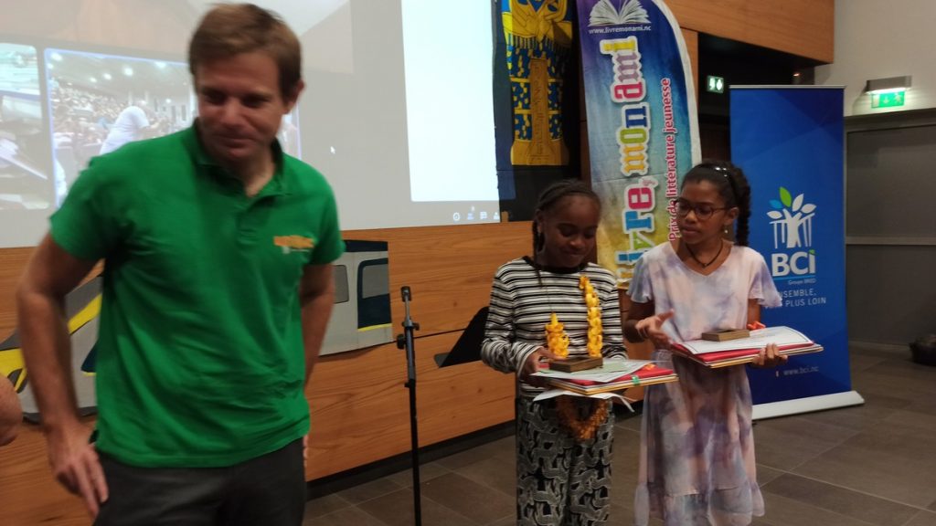 Les enfants récompensés aujourd’hui s’appellent, pour les lauréats : Audrey, Paméla, Maïa et Maïana ; et pour les prix d’encouragement : Mériné, Gwénaël, Lily-Kate, Raphaël, Jean-Baptiste, Mery, Dayana, Florentine et Raymonde. Certains sont venus de loin voire très loin, par exemple Canala, Lifou, Maré ou Tiabet, tout au nord.