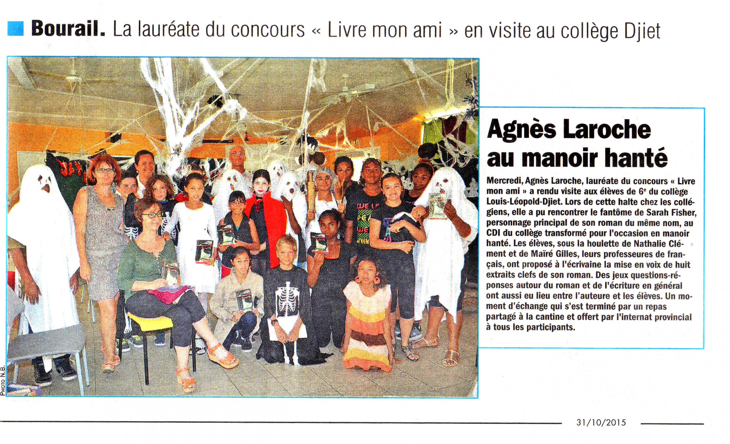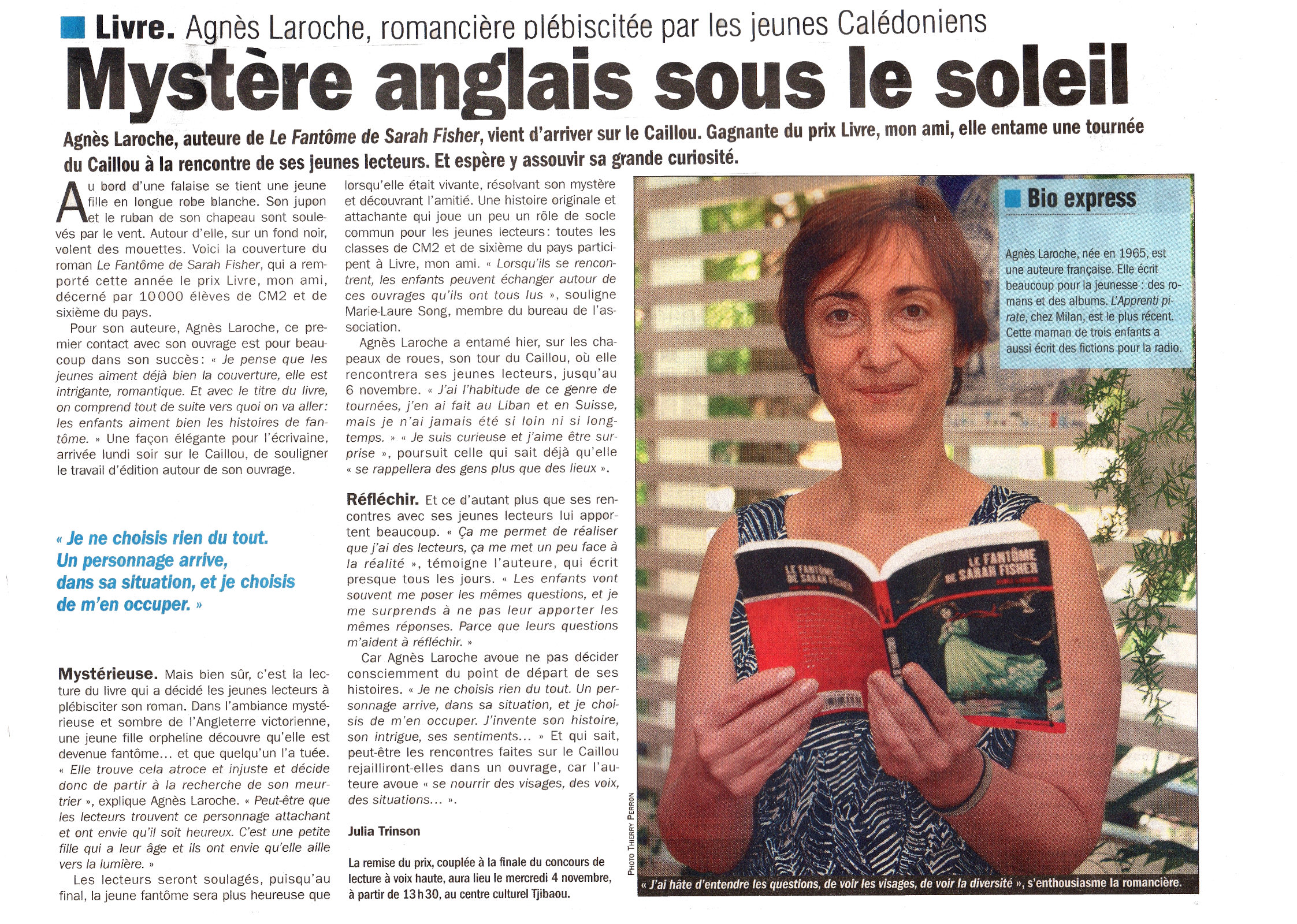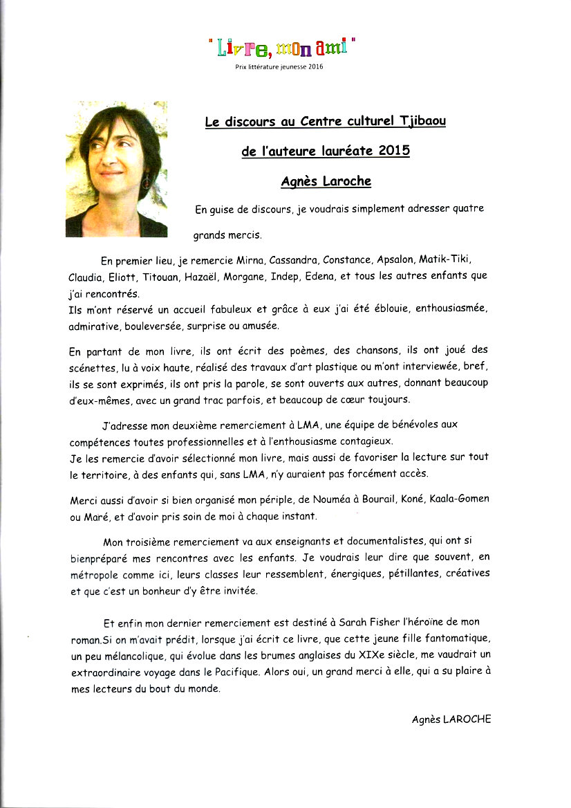 Lauréate de notre prix en 2015, avec son roman « le fantôme de Sarah Fisher », elle avait su vaincre sa grande peur de l’avion pour passer en Nouvelle-Calédonie, avec nos élèves deux semaines merveilleuses de rencontres avec ses lecteurs. Nous avions apprécié sa grande gentillesse, sa discrétion, sa présence authentique et généreuse auprès des élèves. Au delà d’une grande autrice de littérature jeunesse, nous perdons une amie qui restera dans nos cœurs. Nos pensées vont à sa famille et à ses proches à qui nous adressons nos plus sincères condoléances et nos pensées de soutien.