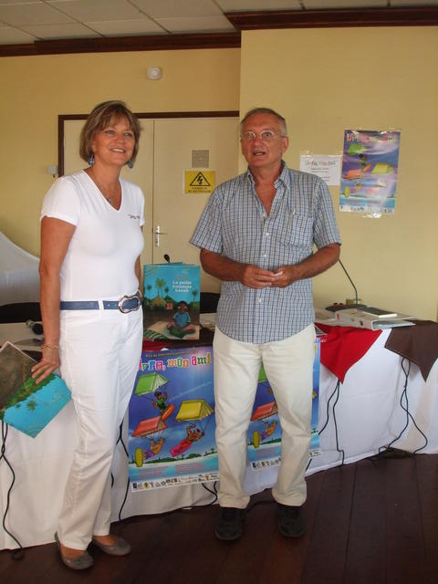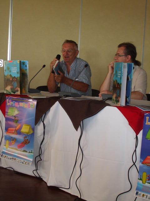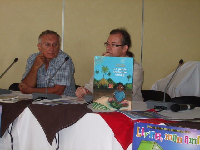 Yannick avec l’éditeur Gilles Colleu, responsable de Vents d’ailleurs, éditeur de la petite Tresseuse kanak (accéder au site).